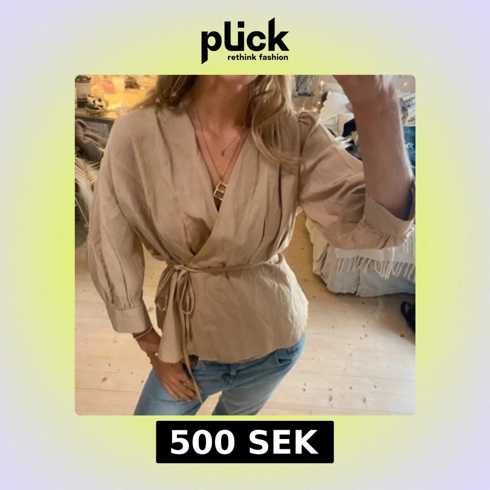 Snygg beige omlottblus med trekvartsärmar och knytband i midjan. Blusen har en djup v-ringning och lätt puffade ärmar för en trendig look. Tillverkad i ett tunt, mjukt tyg som ger ett avslappnat men stilrent intryck.