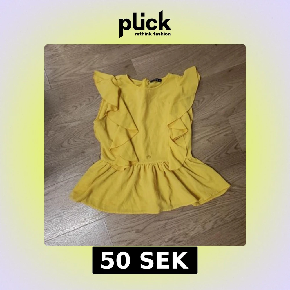 Snygg gul blus med volanger längs sidorna och en lös, flowy passform. Blusen är ärmlös och har en rund halsringning samt en lätt utsvängd nederdel. Den är från Shein och har en liten fläck i mitten.
