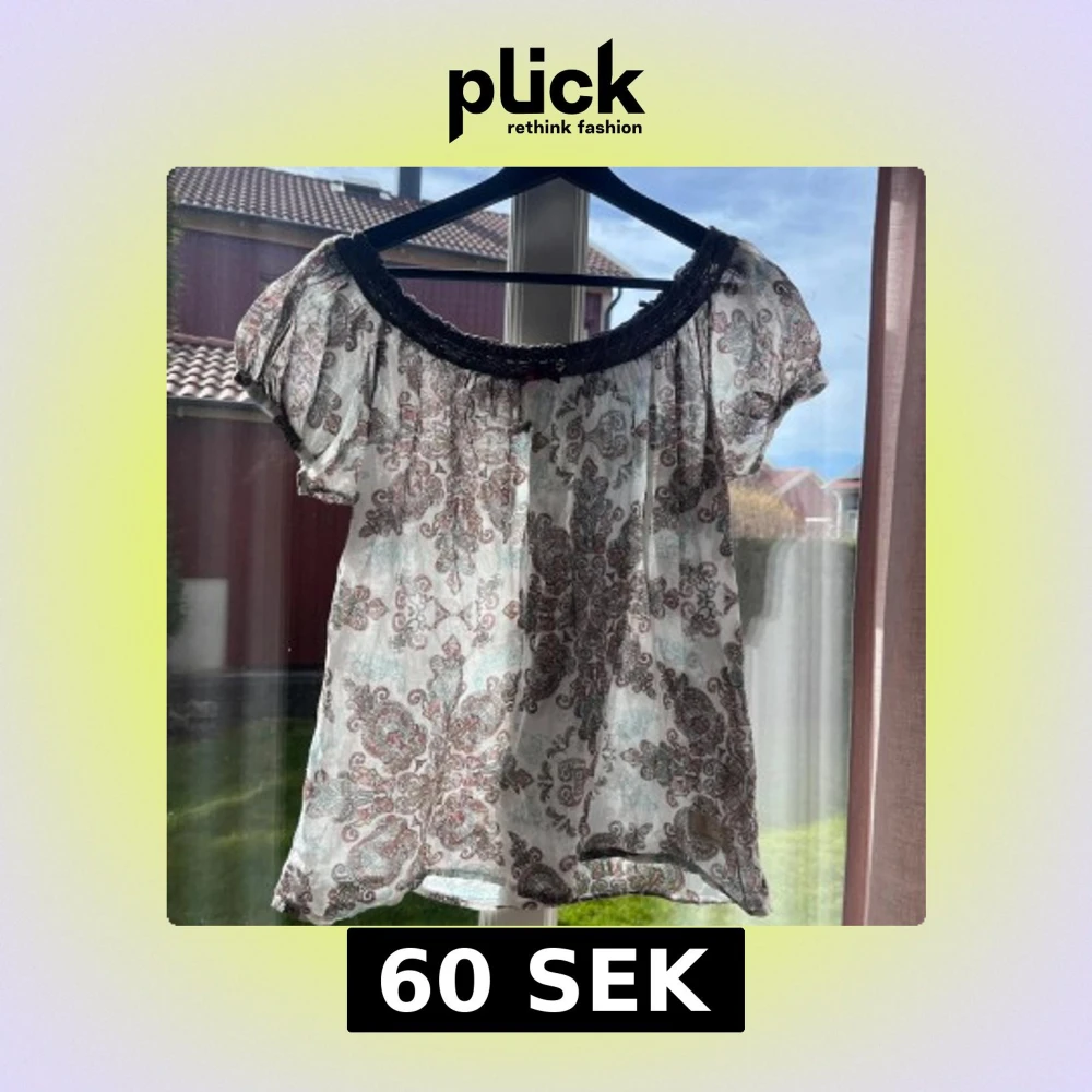 Charmig blus med ett detaljerat paisleymönster i dämpade färger. Blusen har korta ärmar och en vacker spetskant vid halsringningen, prydd med en liten rosett. Sjukt söt!