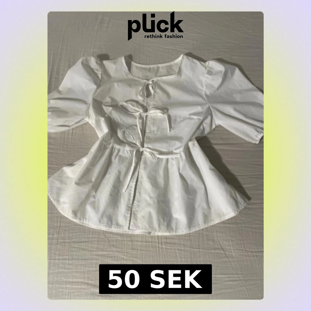 En fin vit blus med rosetter i fram. Puffiga korta ärmar och utsvängd nederdel. Aldrig använd och inga fläckar. Skulle nog inte säga att det är en S dock, jag brukar ha M och den var nästan lite stor.