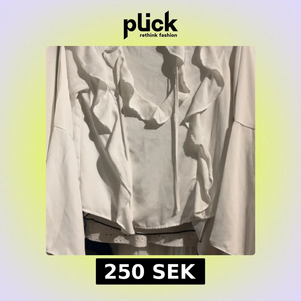Supersnygg vit blus med volangdetaljer längs framstycket och knytband vid halsen. Blusen har långa ärmar med lätt utsvängd form och är gjord i ett mjukt, flowy material som ger en chill vibe. Perfekt för dig som gillar romantiska detaljer och vill sticka ut.