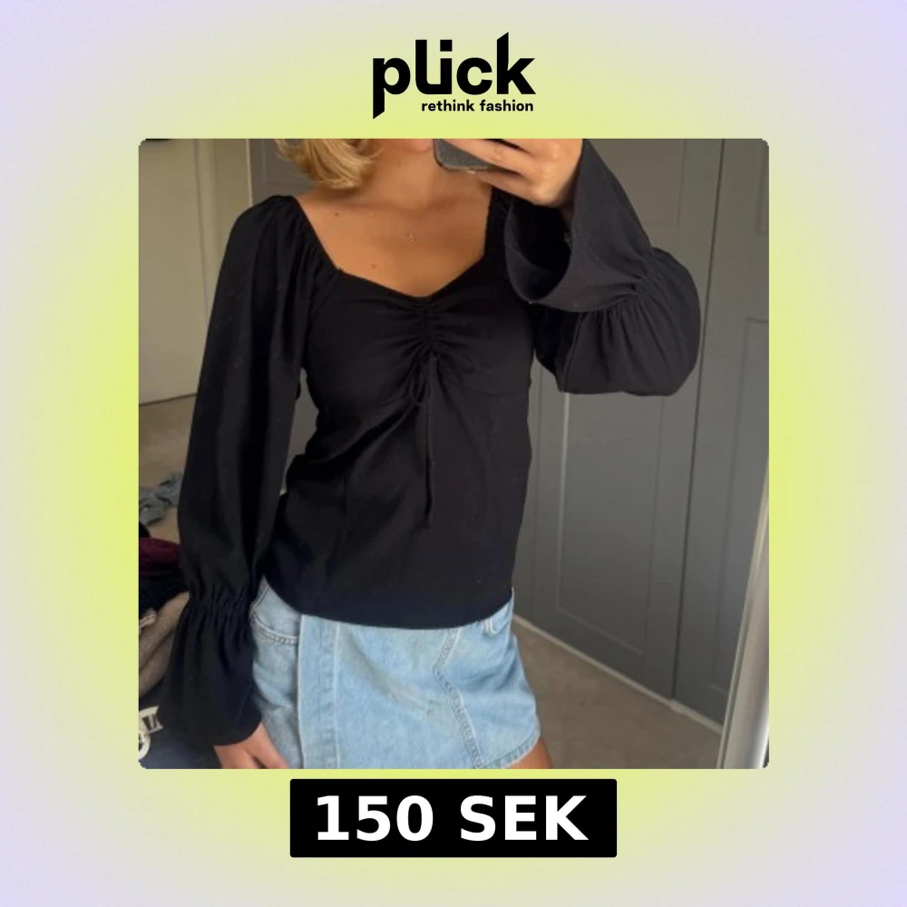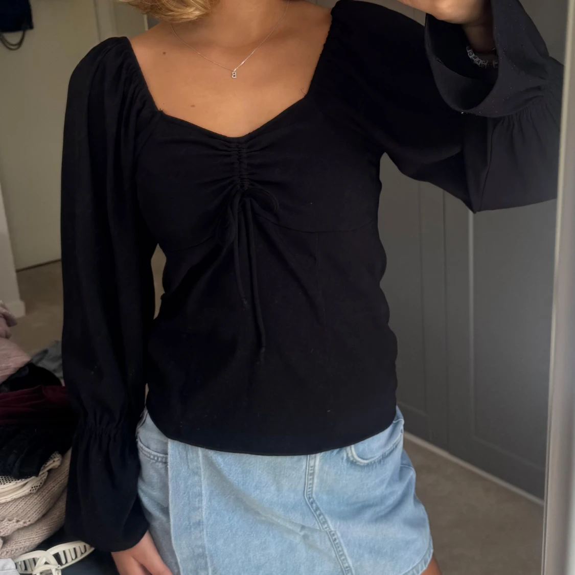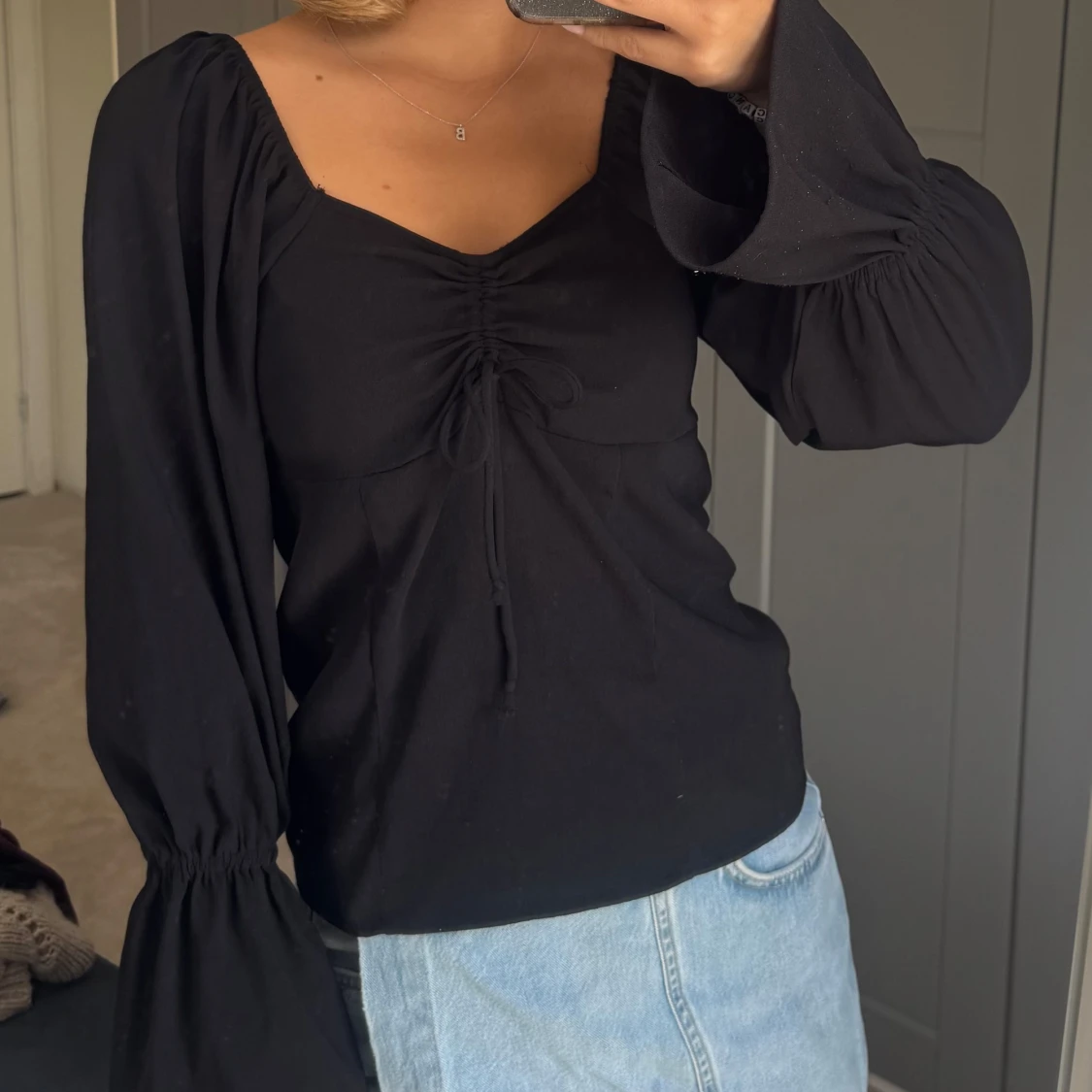 Snygg svart blus med lång puffärm och v-ringad hals. Snörningsdetalj framtill som ger en unik look. Passar dig som vill ha en trendig och bekväm topp.