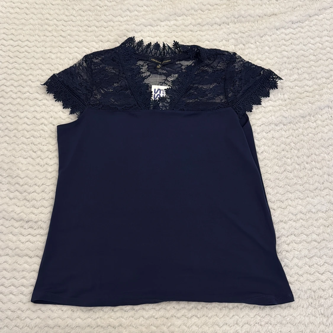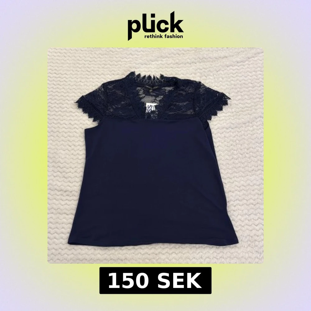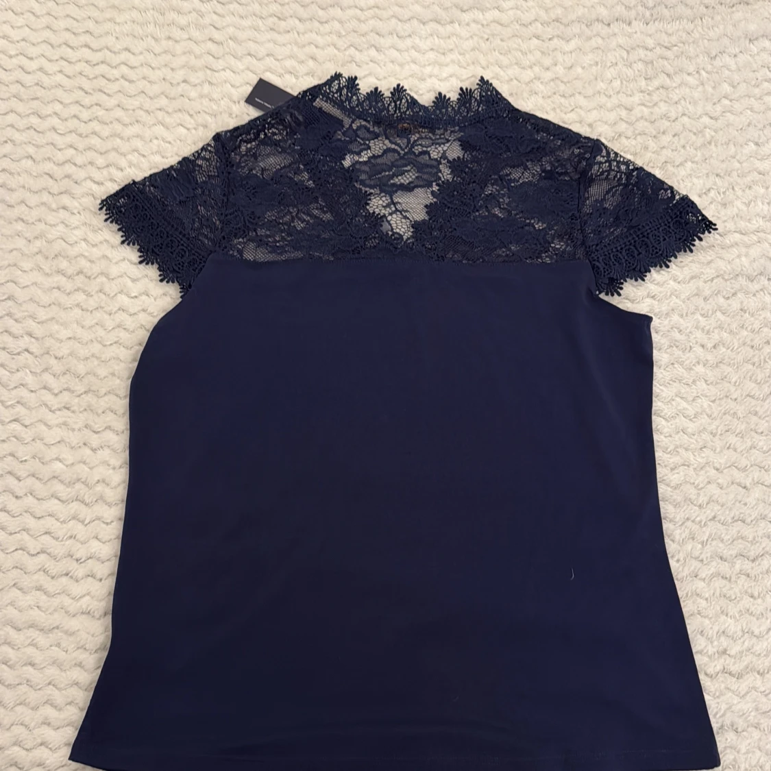 Supersnygg mörkblå blus från Adrienne Vittadini med v-ringning och detaljerad spets upptill och på ärmarna. Blusen har korta ärmar och en elegant, feminin look med mjukt tyg nedtill och transparent spets upptill. Perfekt för dig som gillar stilrena och trendiga plagg. (Den har etiketten kvar och är jätte fin på men kommer inte till användning.)