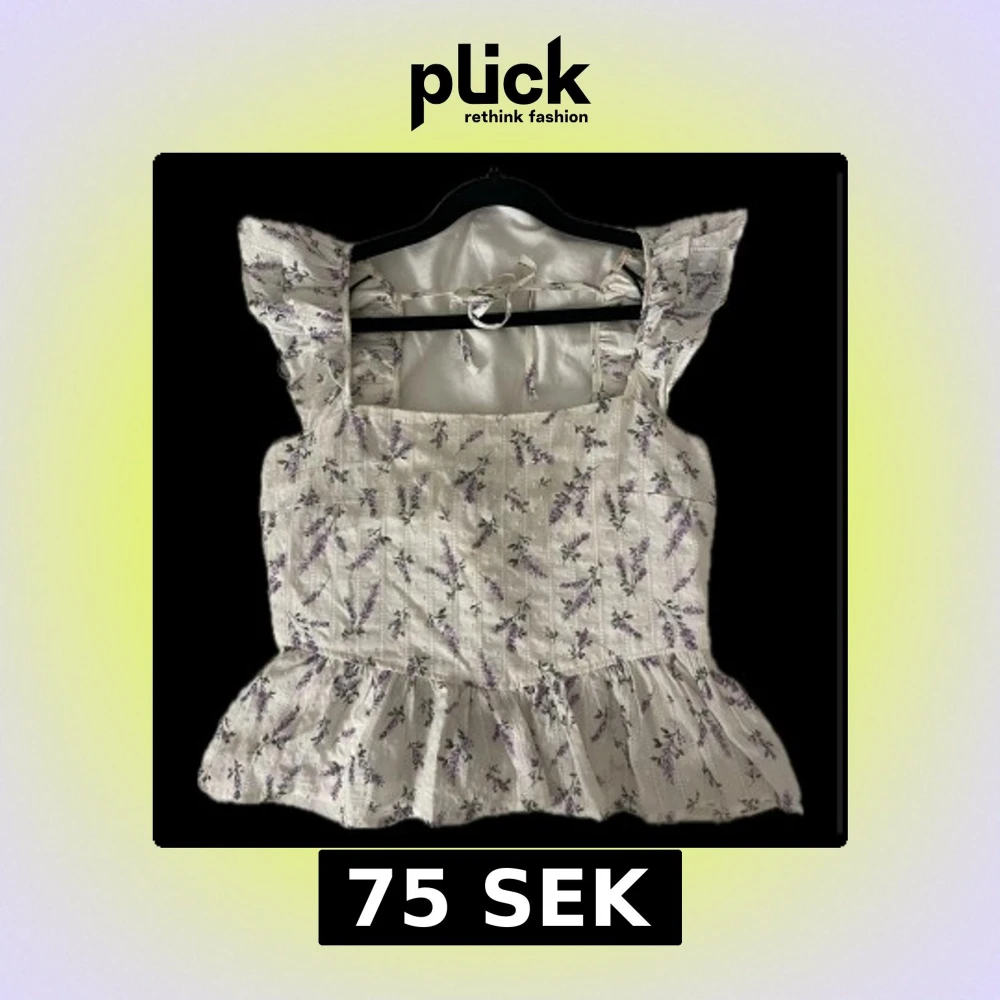 Supersöt topp med volangärmar och blommigt lavendelmönster i lila och grönt på vit botten. Toppen har fyrkantig ringning, smock i ryggen och knytband vid nacken. Perfekt för sommarens alla tillfällen!