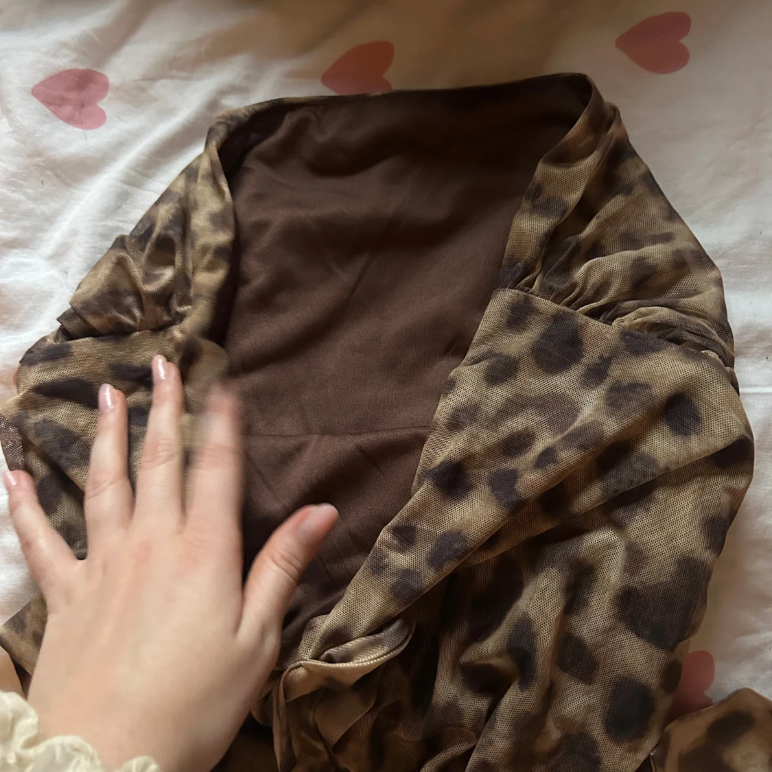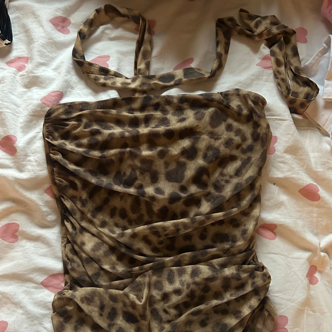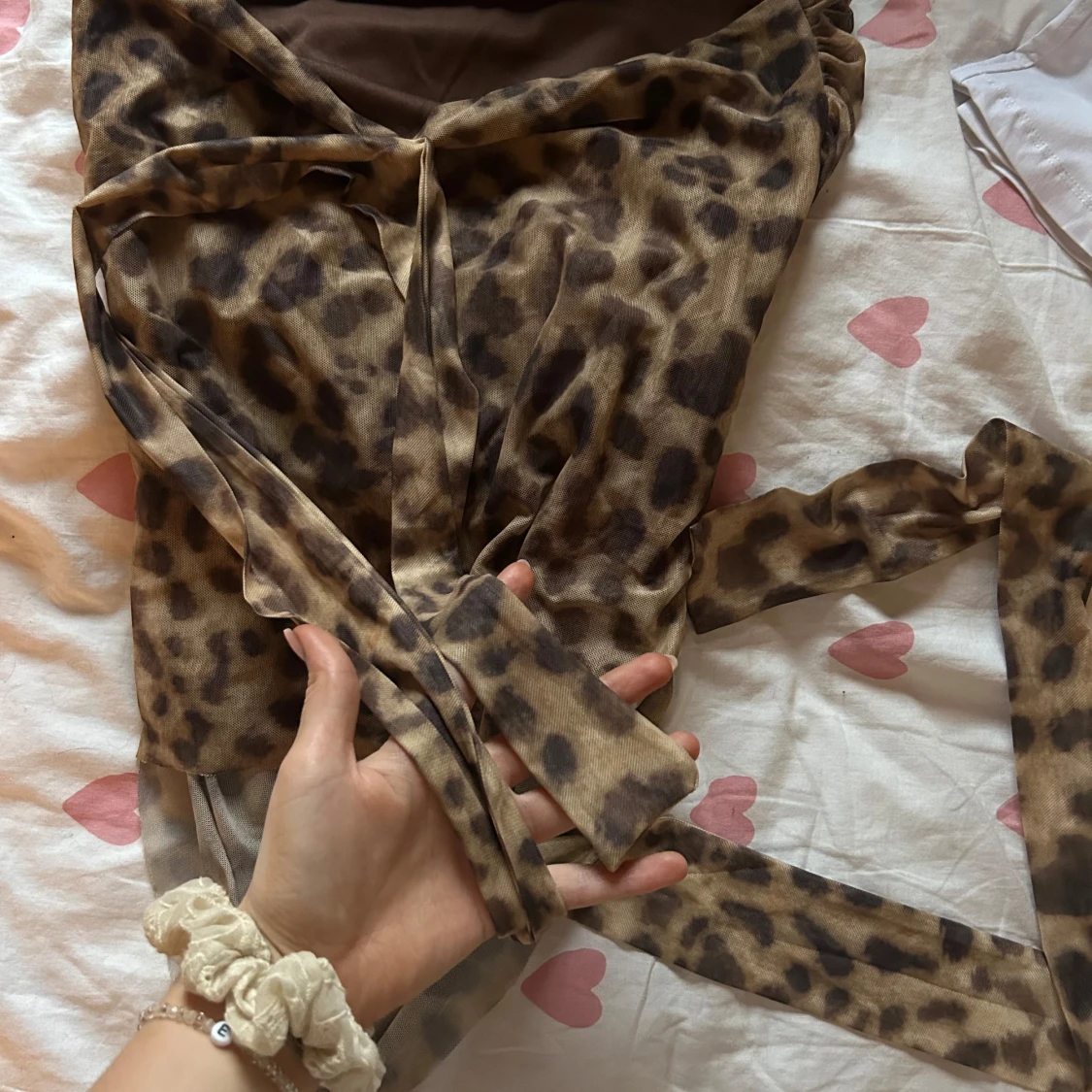Säljer en snygg leopardmönstrad toppen med omlott-design och knytband. Toppen är axelbandslös och har en tight passform som framhäver figuren.
