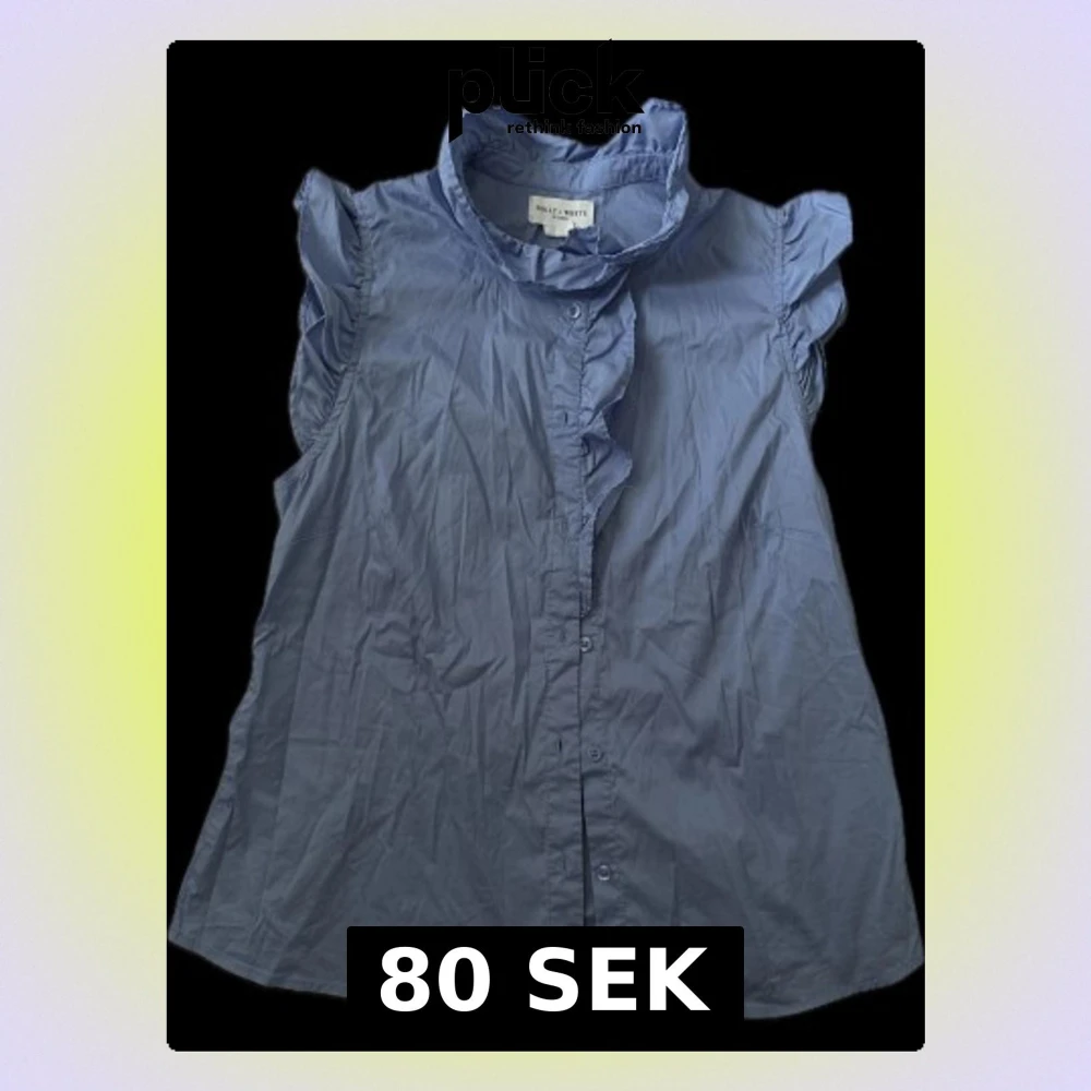 Snygg blå blus från Holly & Whyte med volangdetalj längs knäppningen och liten ståkrage. Blusen är ärmlös med lätt puffade axlar och har en rak passform Inga defekter.
