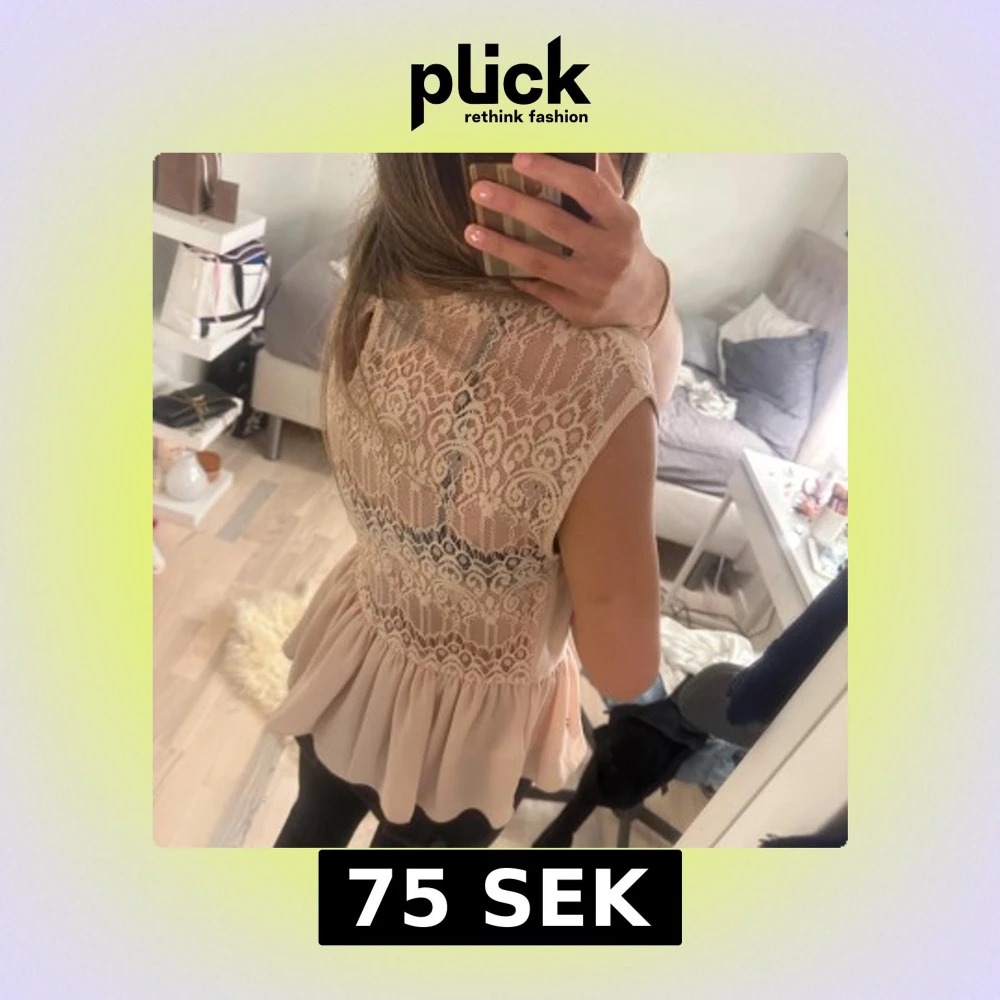 Supersöt beige blus med volang nertill och detaljerad spets på ryggen. Framsidan är enkel och slät medan baksidan har ett vackert spetsmönster som ger en romantisk vibe. Ärmlös modell med rund halsringning och lätt, flowigt tyg.