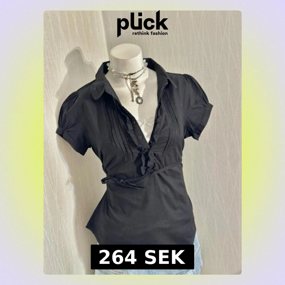 Stilren svart blus med puffiga korta ärmar, krage och v-ringning med volangdetaljer. Blusen har knytband i midjan för en figurnära passform och dekorativa sömmar framtill. Perfekt att matcha med jeans eller kjol för en trendig look.