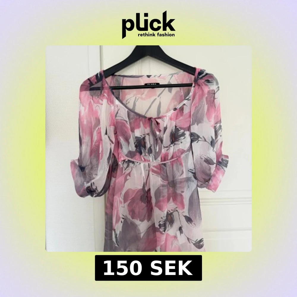 Supersöt kortarmad blus från Clara med stora blommönster. Lätt och luftig med transparenta ärmar, knytning vid halsen! 🩷🌸💕