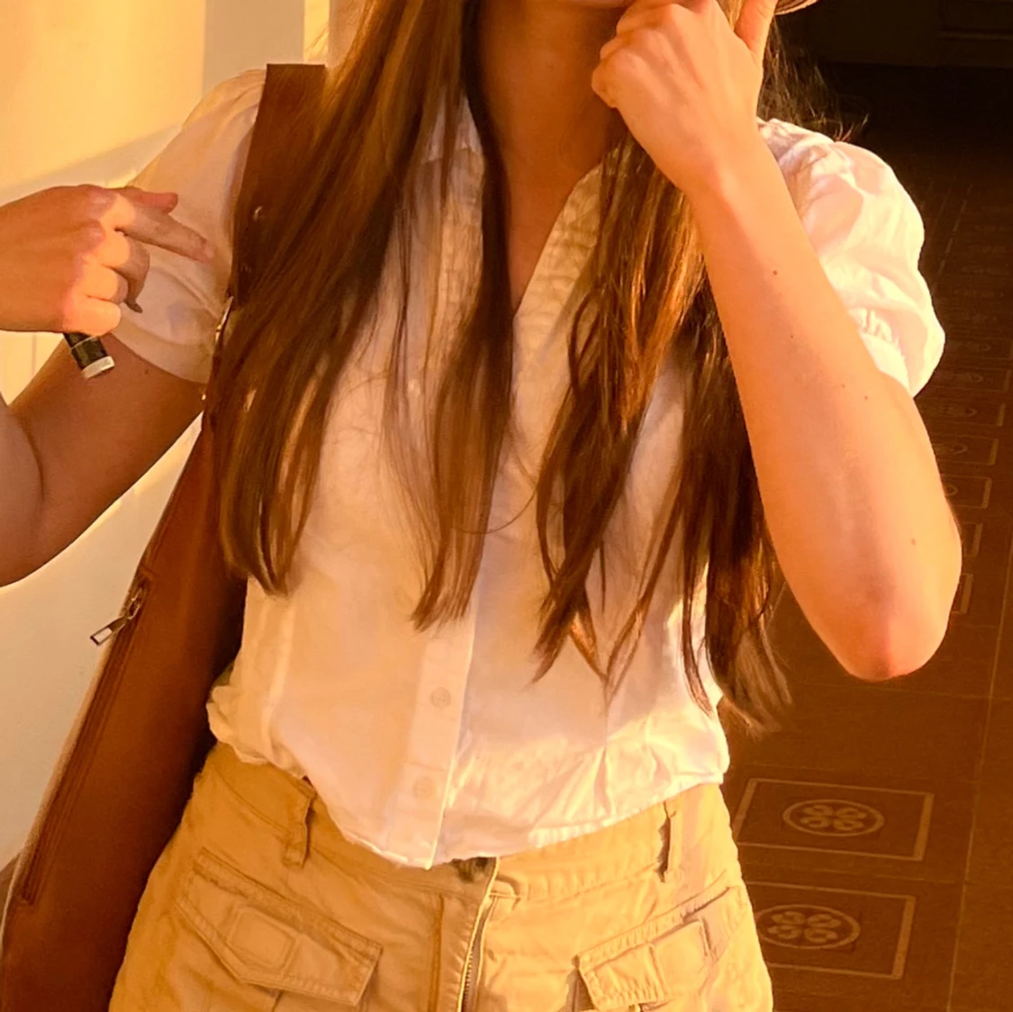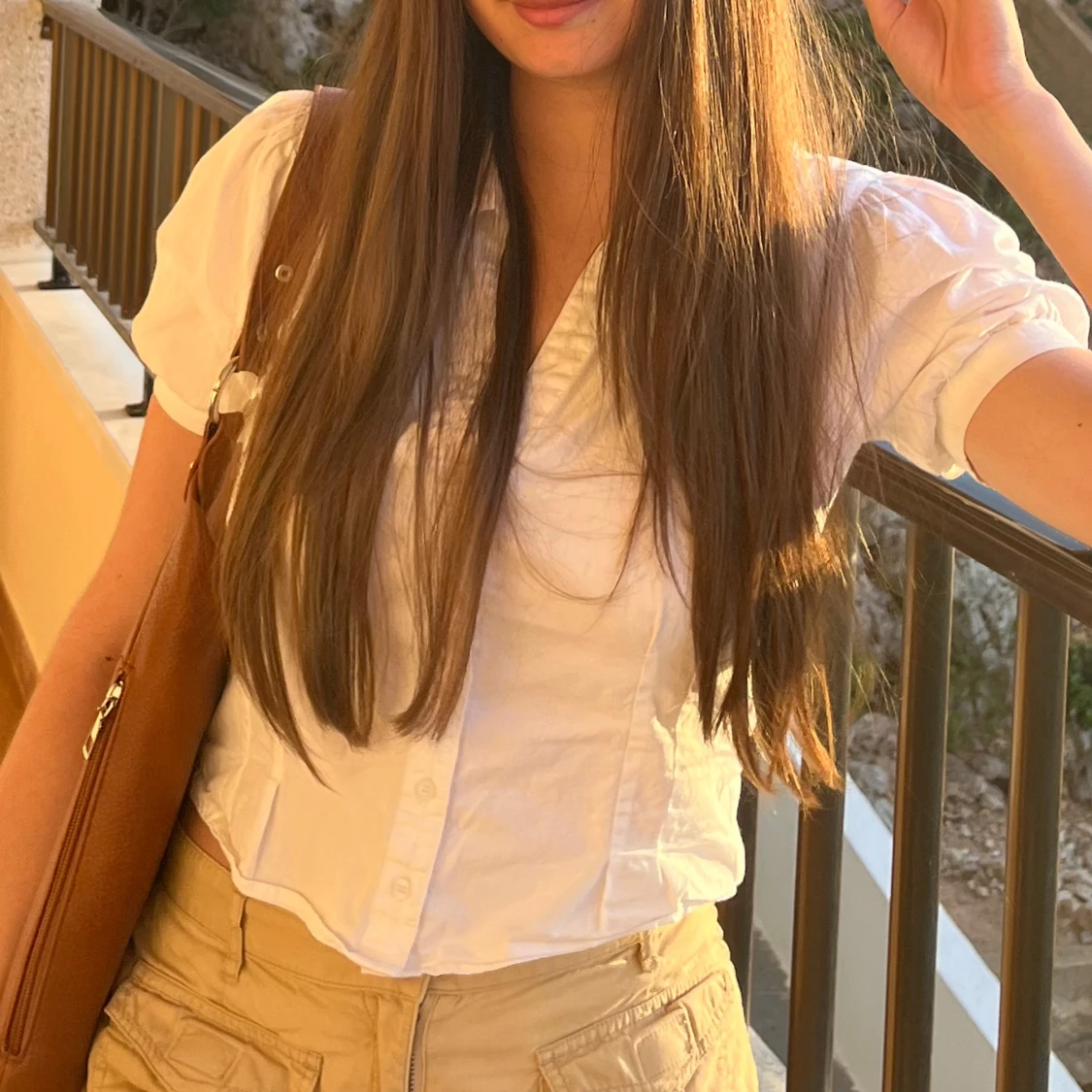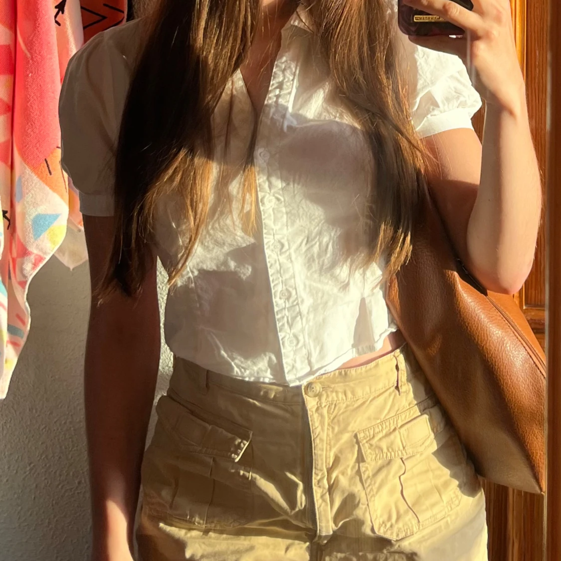 Säljer en vit croppad skjorta med korta puffärmar och klassisk krage. Skjortan har knappar framtill och är i ett lätt bomullstyg, perfekt för varma dagar. Enkel och stilren modell som ger en fräsch look.