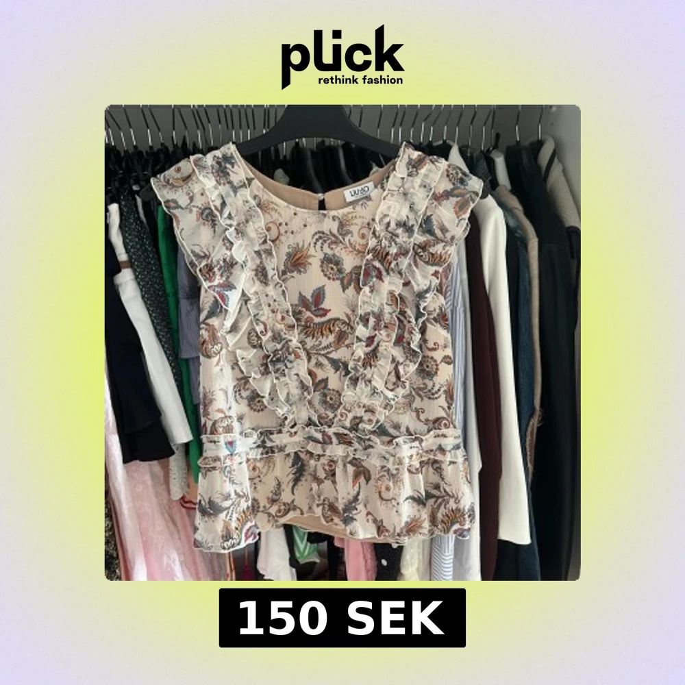 Supersöt blommig blus från LIU JO i ljusbeige med volangdetaljer framtill och längs axlarna. Blusen är ärmlös och har ett romantiskt mönster i blått, orange och brunt. Tillverkad i ett lätt, transparent material som ger en luftig känsla.