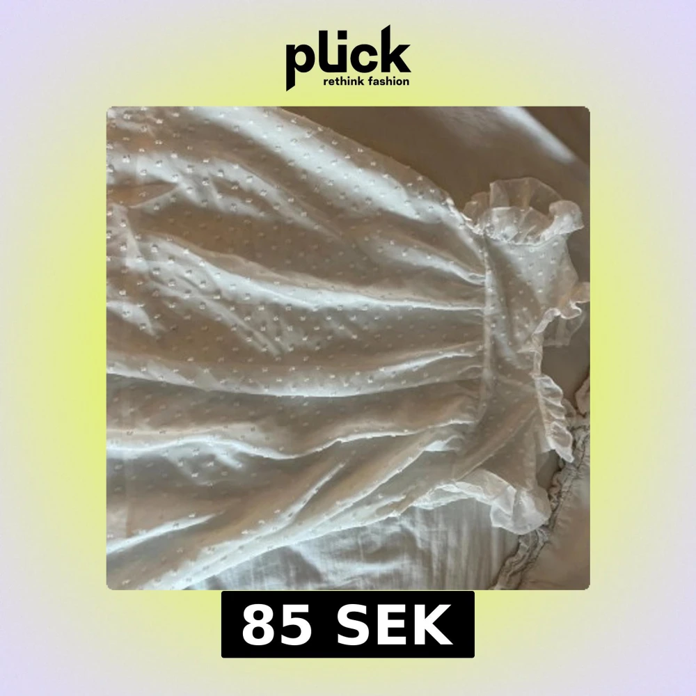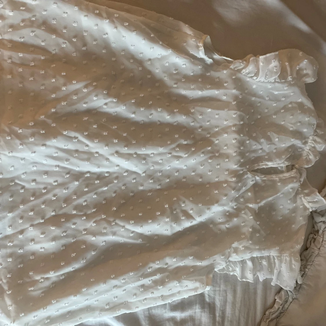Supersöt vit blus med små prickar i tyget och volangdetaljer vid ärmslut och halsringning. Klänningen är ärmlös och har en luftig känsla, perfekt för varma dagar. Materialet känns lätt och andas, vilket gör den extra bekväm.