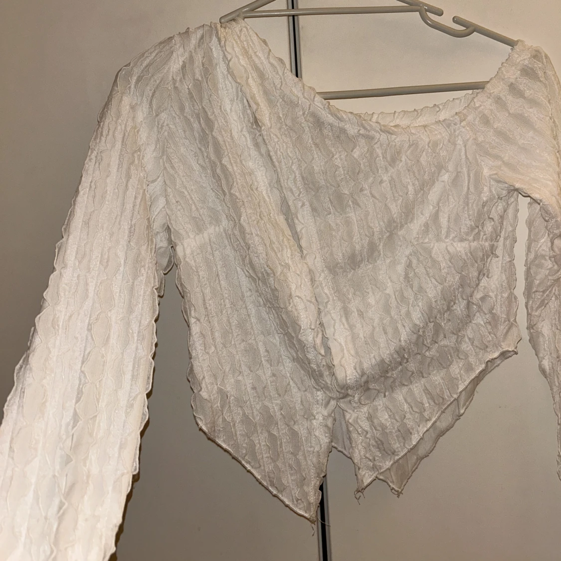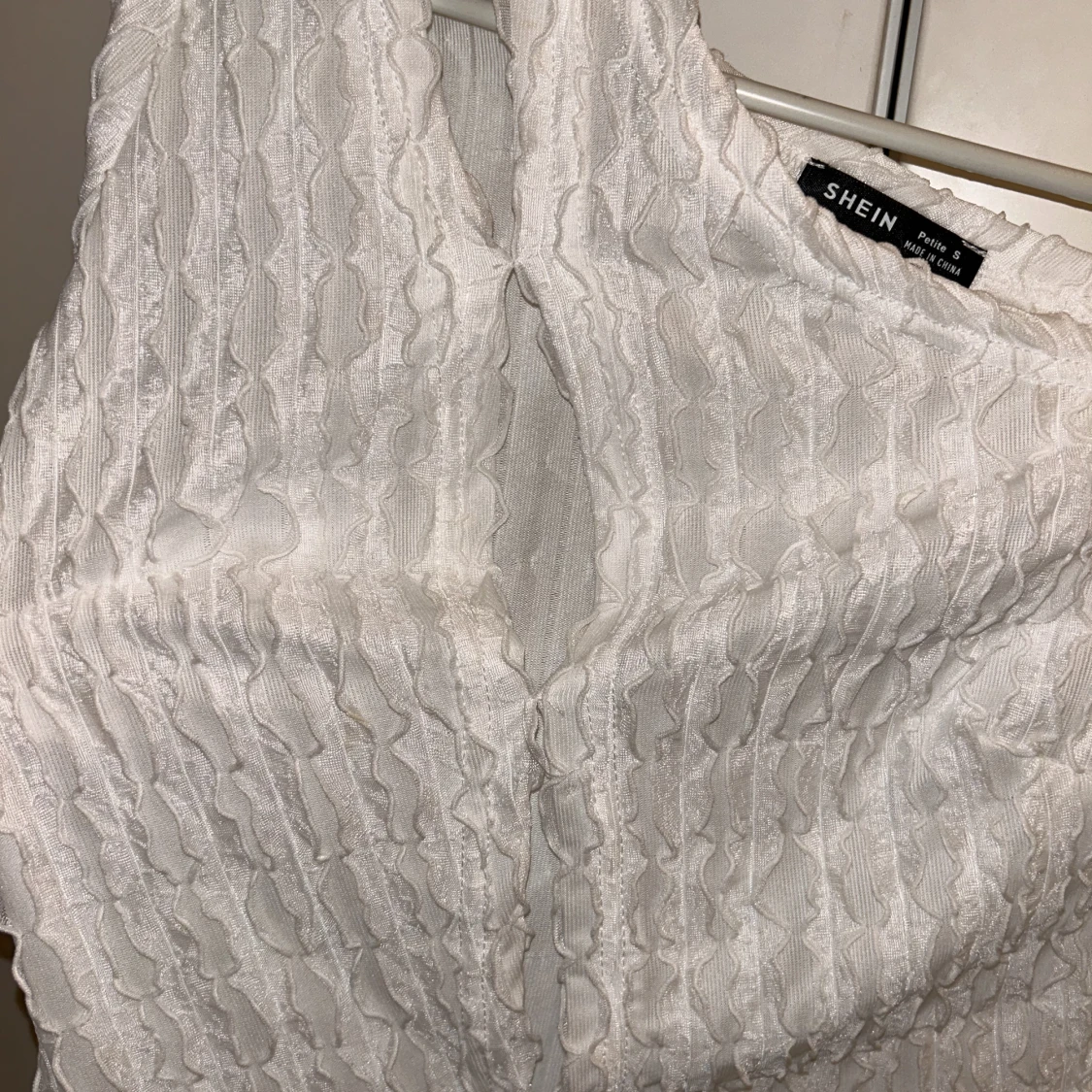 Vit tröja med mönster från shein, små öppningar typ snett från axeln o ner