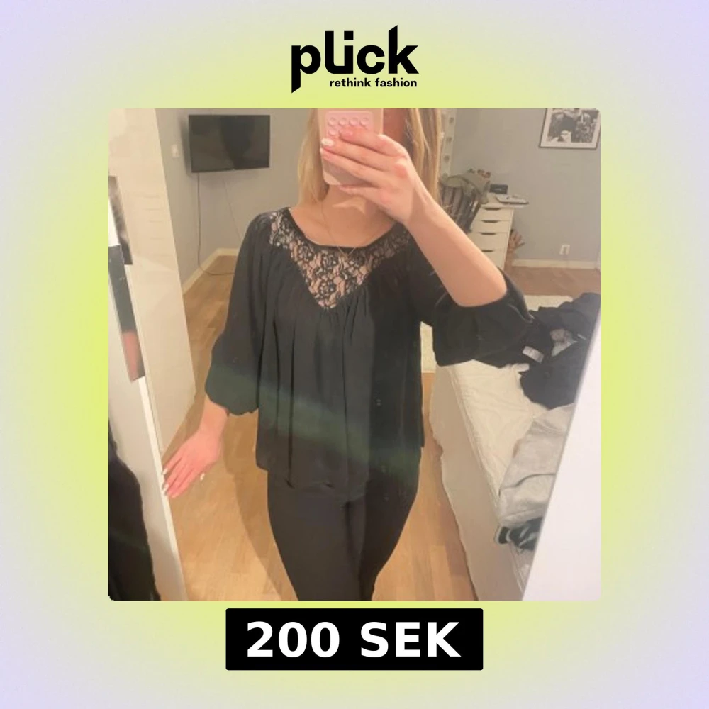 Elegant svart blus med vackra spetsdetaljer vid halsringningen. Blusen har långa ärmar som går att dra upp till trekvarts som jag har på bild och en lös passform som ger en stilren look. ☺️