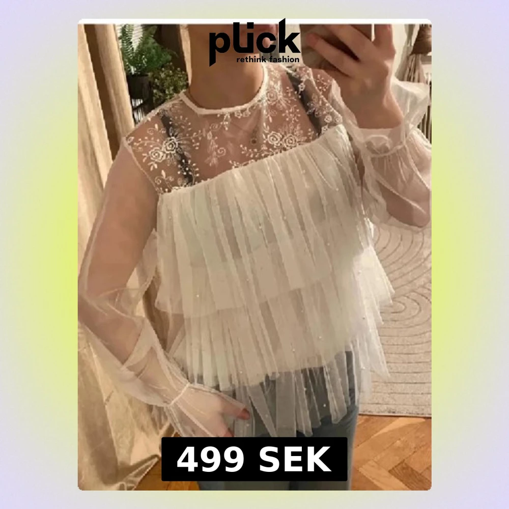 Superfin vit blus i transparent mesh med lĂ„nga Ă€rmar, volanger och smĂ„ pĂ€rlor. Ăverdelen har broderade blommor i spets och knytning bak i nacken. Perfekt för dig som gillar romantisk och drömmig stil. SĂ€ljes till bĂ€sta pris! Liknar Ida Sjöstedt blusen. Se sista bild för den lilla defekten men syns knappt nĂ€r man har pĂ„ sig den dĂ„ volangerna tĂ€cker detđ