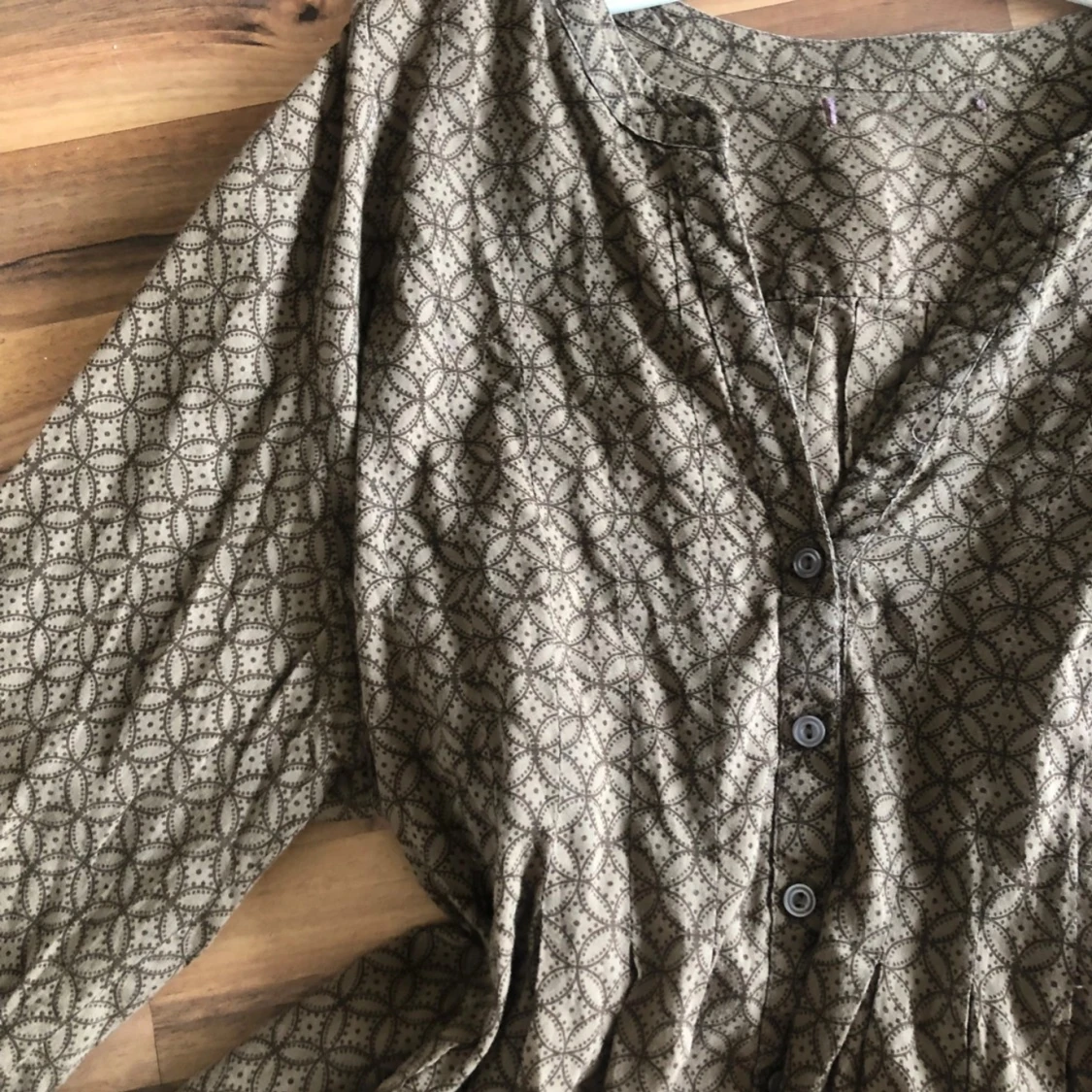 Brun blus med volanger och knappar - SÀljer en brun blus med v-ringning och volangdetaljer framtill. Blusen har knappar lÀngs mitten och trekvartsÀrmar med lÀtt puff. Materialet Àr lÀtt, vilket ger en cool och avslappnad look. Perfekt att styla med jeans eller kjol.