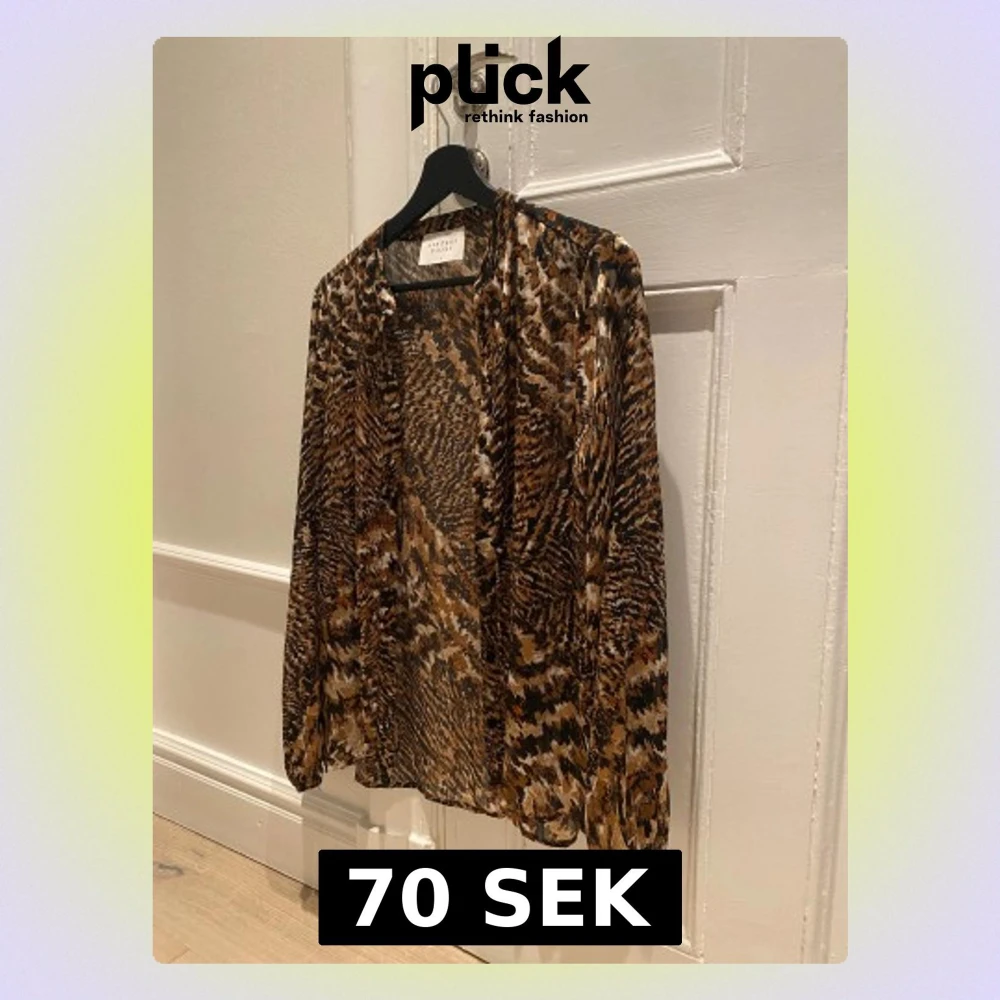Tunn/transparent kofta/blus med leopardmönster i bruna, svarta och beige toner. Ärm med lätt puff och elastisk mudd vid ärmslut. Går att stänga med knappar framtill☺️