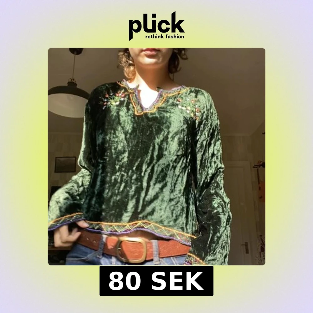 Bohemisk tröja i grön sammet med fina broderier. Ser lite Flower power och hippie ut. Mycket bekväm och mjuk. Utsvängda armar (lånad annons)