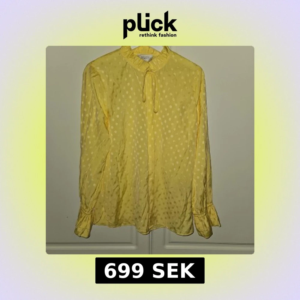 Oanvänd Snygg ljusgul blus med prickar och rosett i halsen. Blusen har volanger vid halsen och vid ärmsluten. Nypris 1299 kr Märke second female