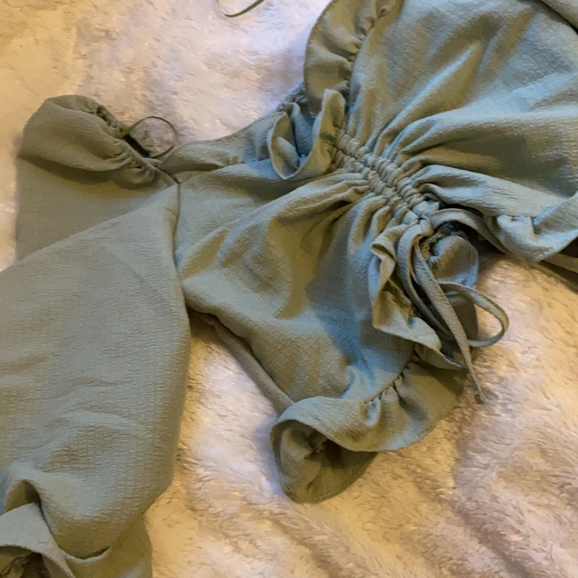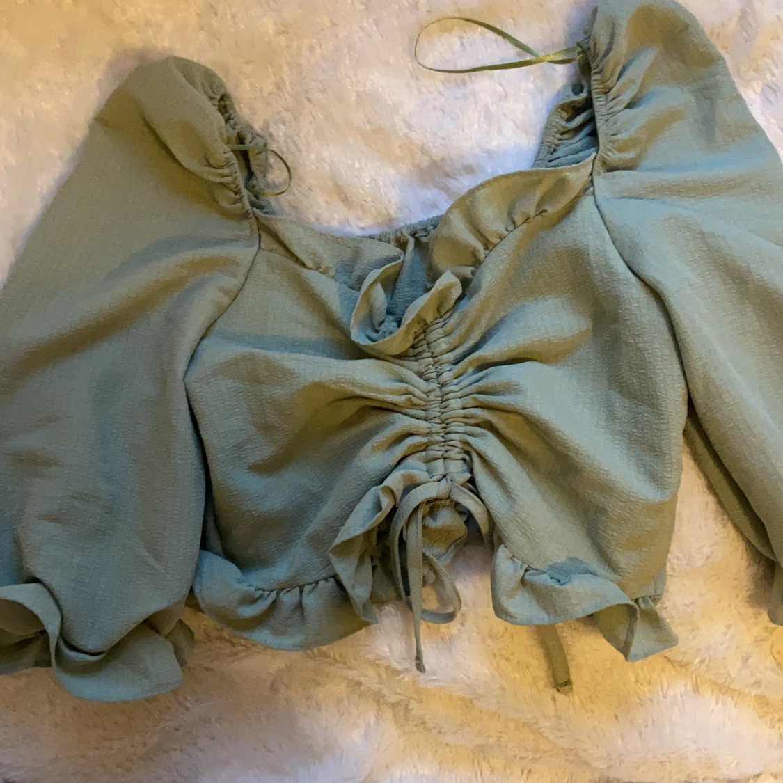 Jättefin grön tröja med väldigt bra material. Materialet går ej att stretcha men man kan justera längden på den som ni ser på de andra bilderna.