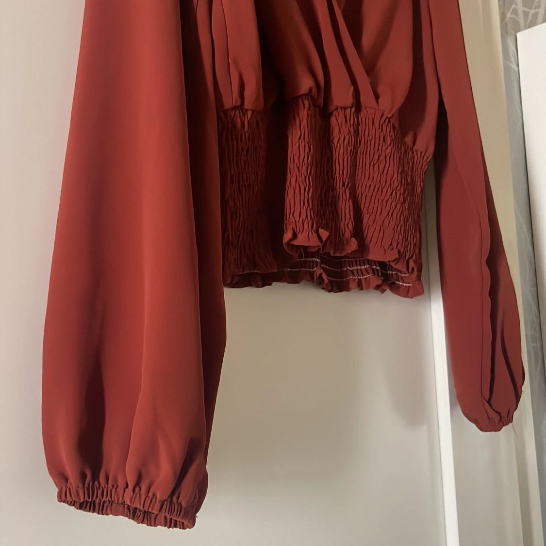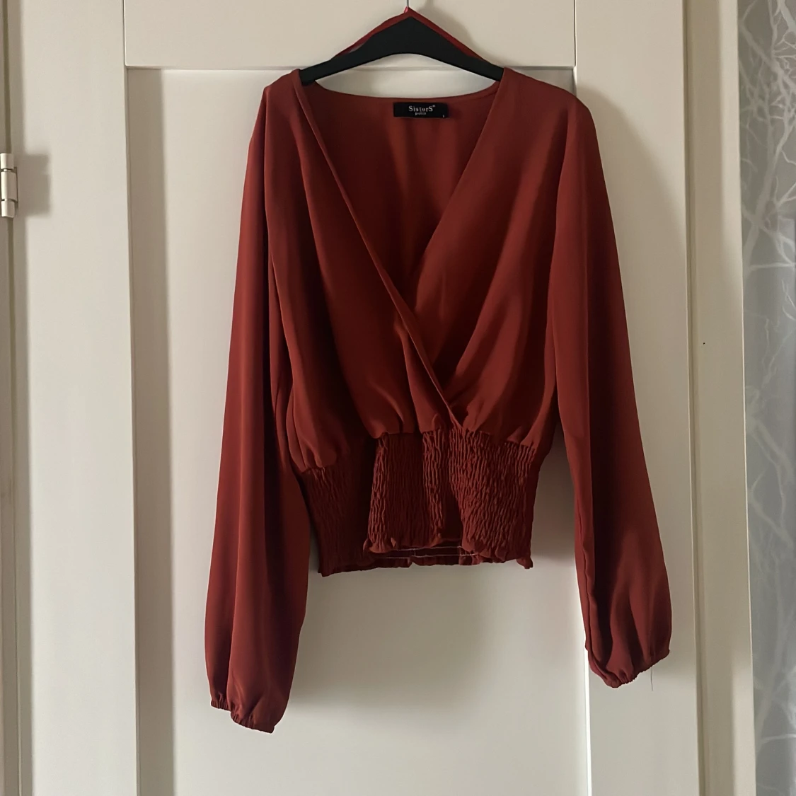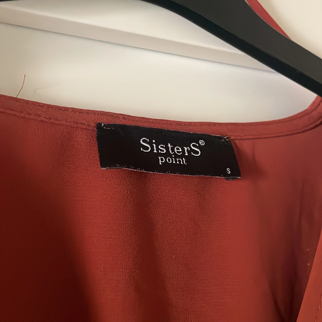 Rost-röd i färgen, jag har satt en säkerhetsnål för att begränsa v-ringningen men går givetvis att justera.