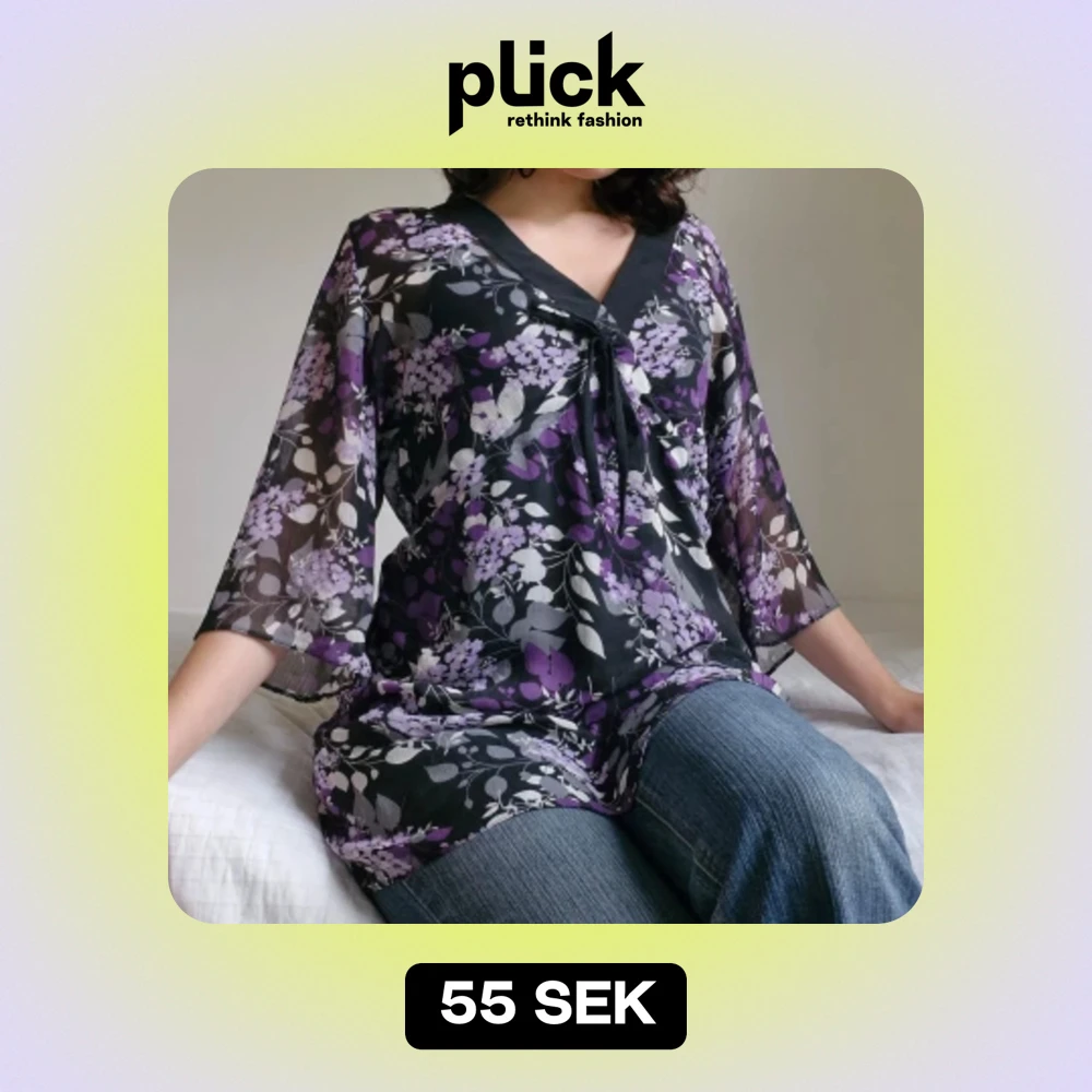 Vacker, skir blus/ kortklĂ€nning med blommor đž V-rigning, trekvartsĂ€rm och rosett framtill. Sparsamt anvĂ€nd, inga defekter! Storleken motsvarar en internationell XXL, men jag rekommenderar den för L-XL om man vill ha en mer oversized passform.