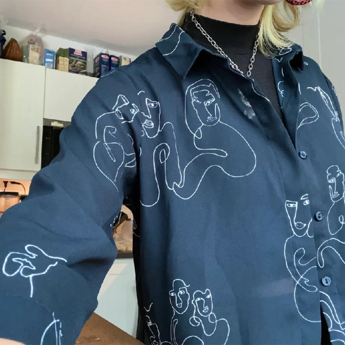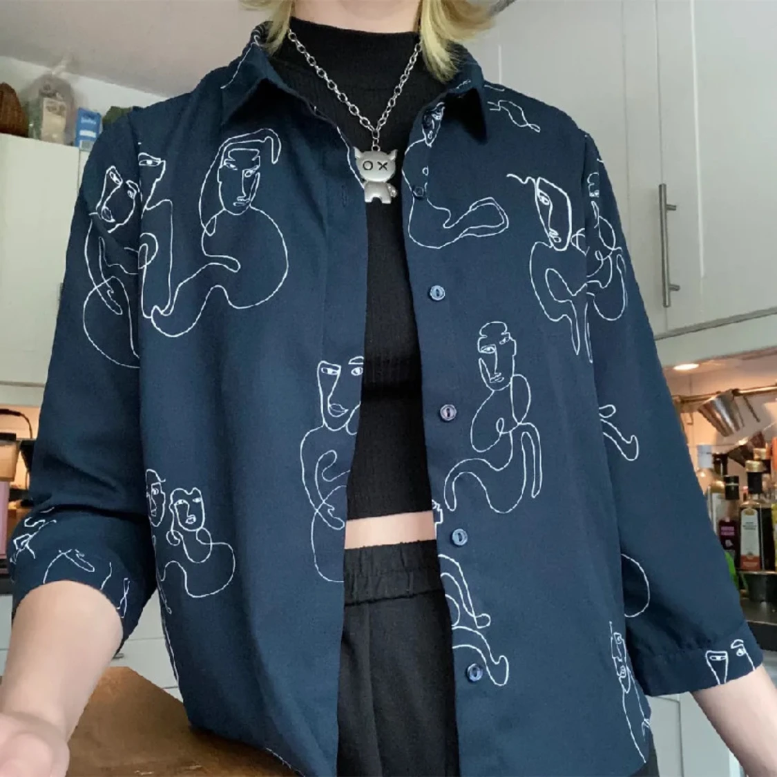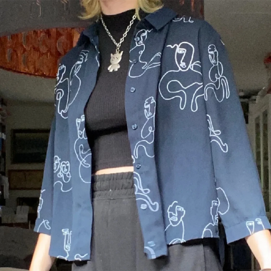Jättefin mörkblå skjorta, köpt här på Plick. Den är i ett tunt material och endast använd ett fåtal gånger- nyskick! Bilderna är lånade.
