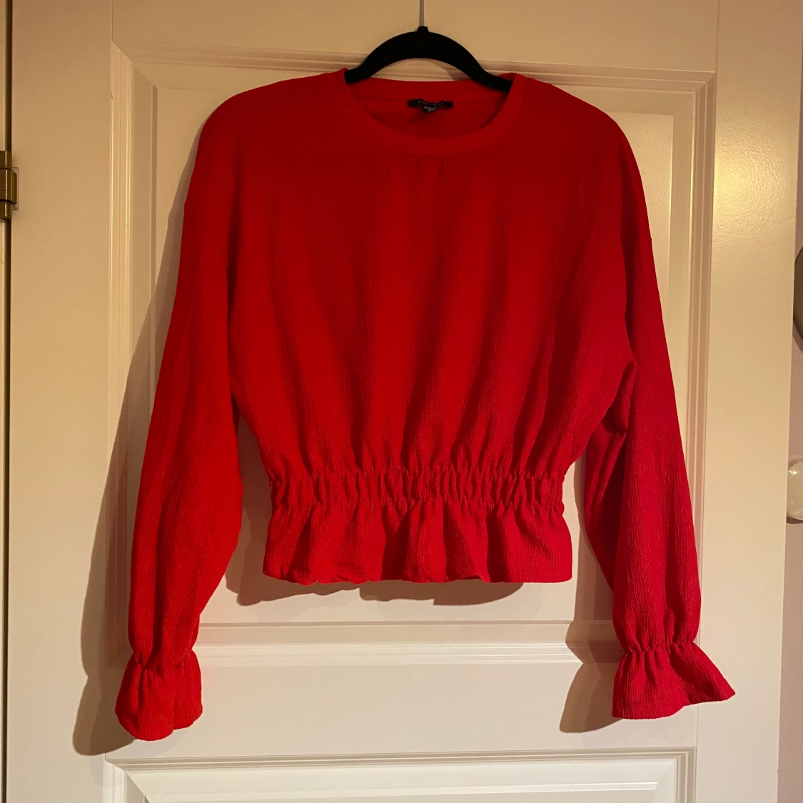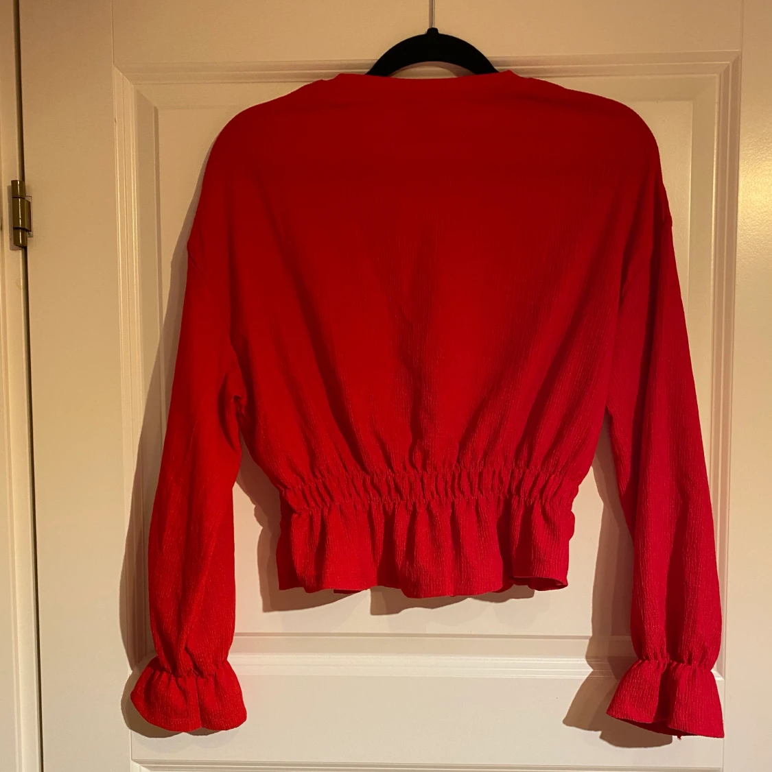 Säljer denna röda blusen. Blusen är gjort av ett väldigt skönt tunt material. Den är perfekt för sommaren/ våren då den inte är för tjock. Den har ett elastiskt band vid magen och handleden som gör den ”puffig”