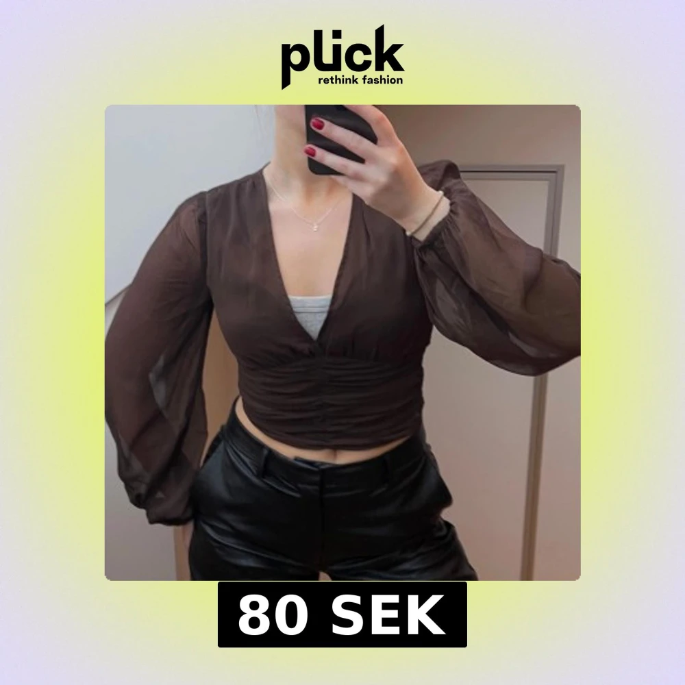 Snygg brun omlottopp från Bik Bok med långa, transparenta ärmar och v-ringning. Toppen är croppad och har en stilren design som passar perfekt för en trendig look. (Har ett linne på mig under)✨