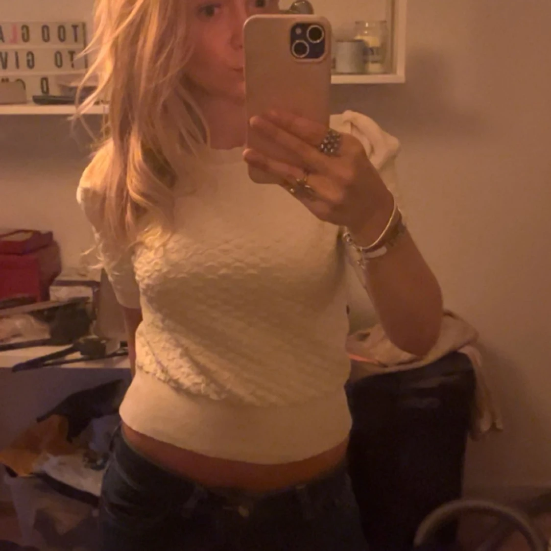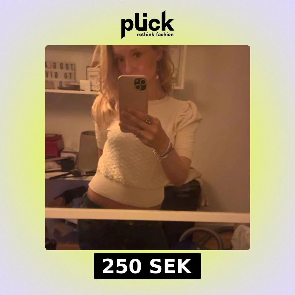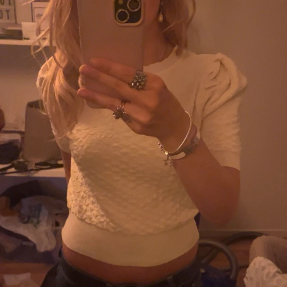 Superfin krämvit croppad topp med korta puffärmar och strukturmönster på framsidan. Tight passform och bred mudd nedtill ger en snygg siluett. Perfekt att styla med jeans eller kjol för en trendig look. Vet tyvärr inte var den är ifrån