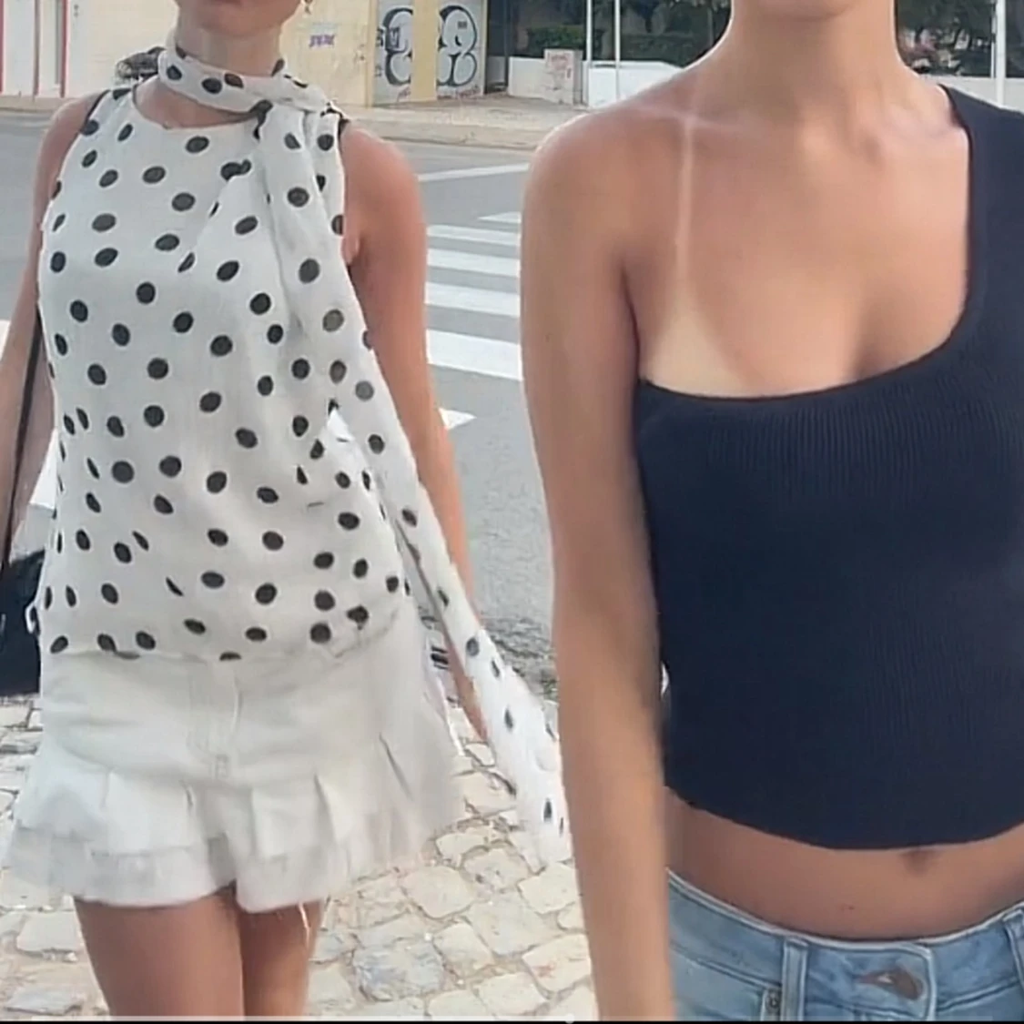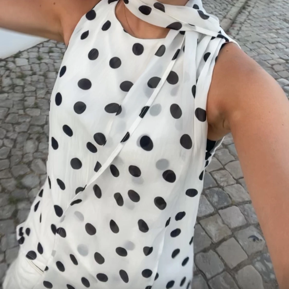 Säljer en vit tröja med svarta prickar och matchande scarf runt halsen. Den är ärmlös och har en luftig passform. Materialet är lätt och ger en skön känsla mot huden. Snygg och trendig look