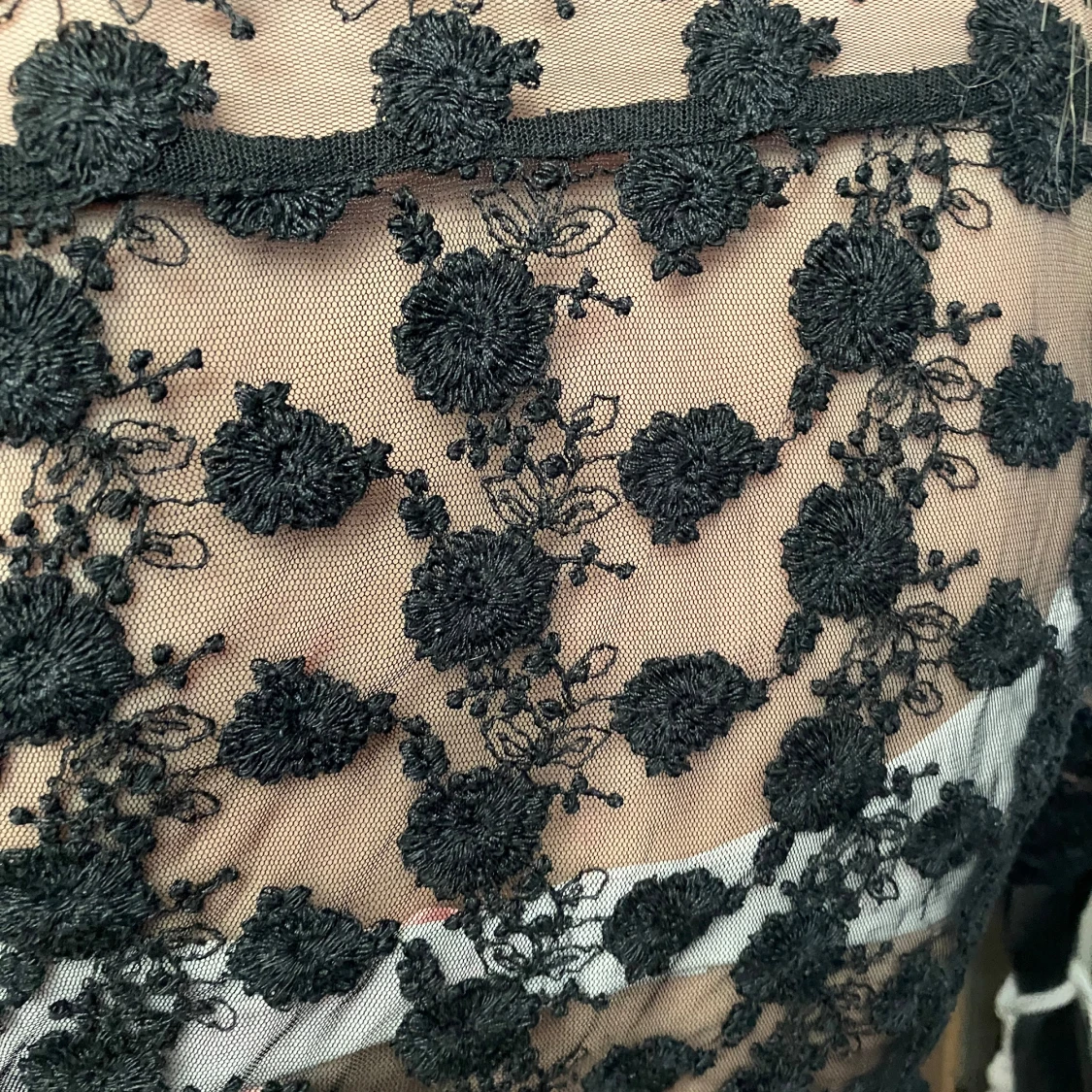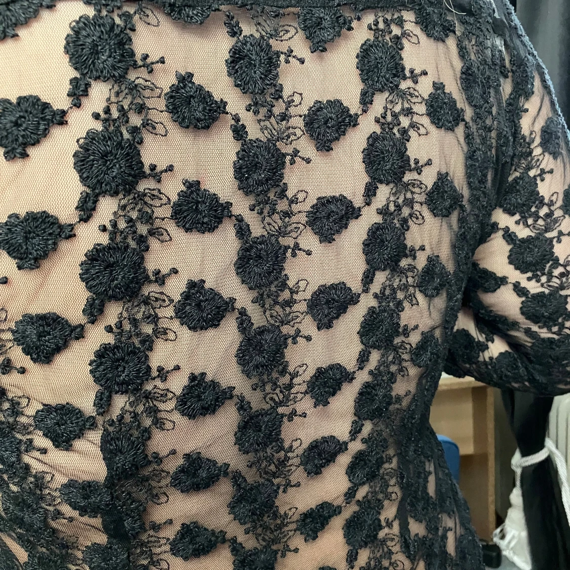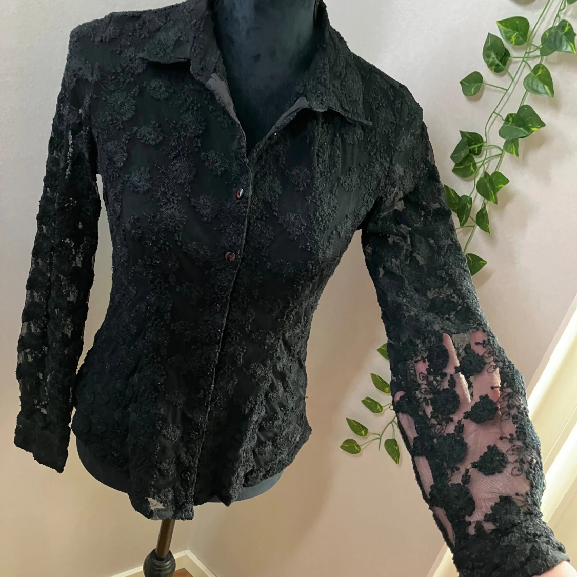 JÀttesnygg, anvÀnd nÄgra gÄnger, genomskinlig spetsblus.