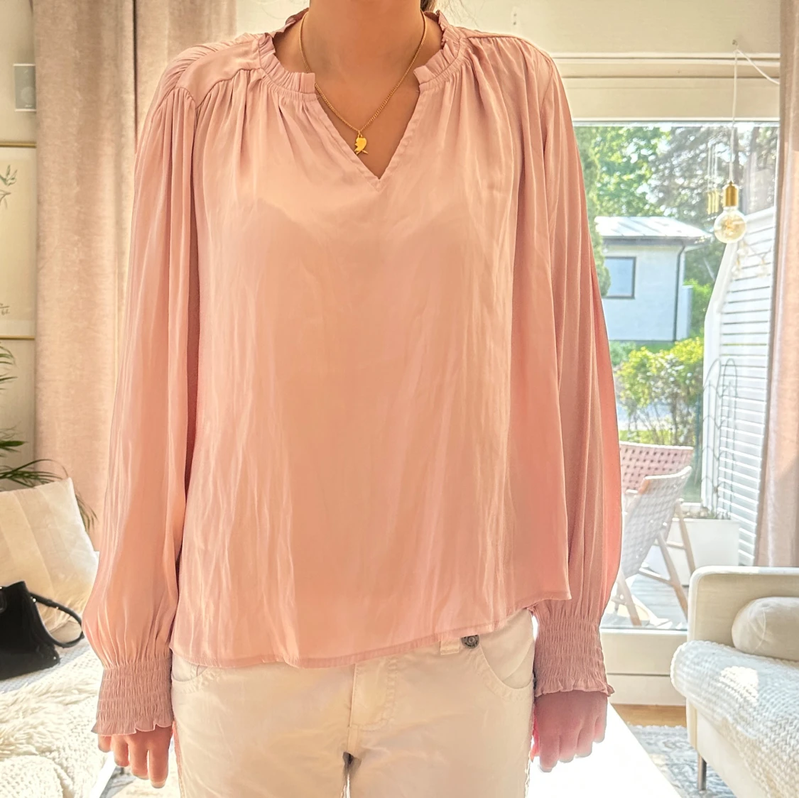 Säljer denna ljusrosa långärmade blusen från neo noir då den inte kommer till användning, använd 1 gång. Jätte tunn och skön, perfekt till sommarkvällar🥰
