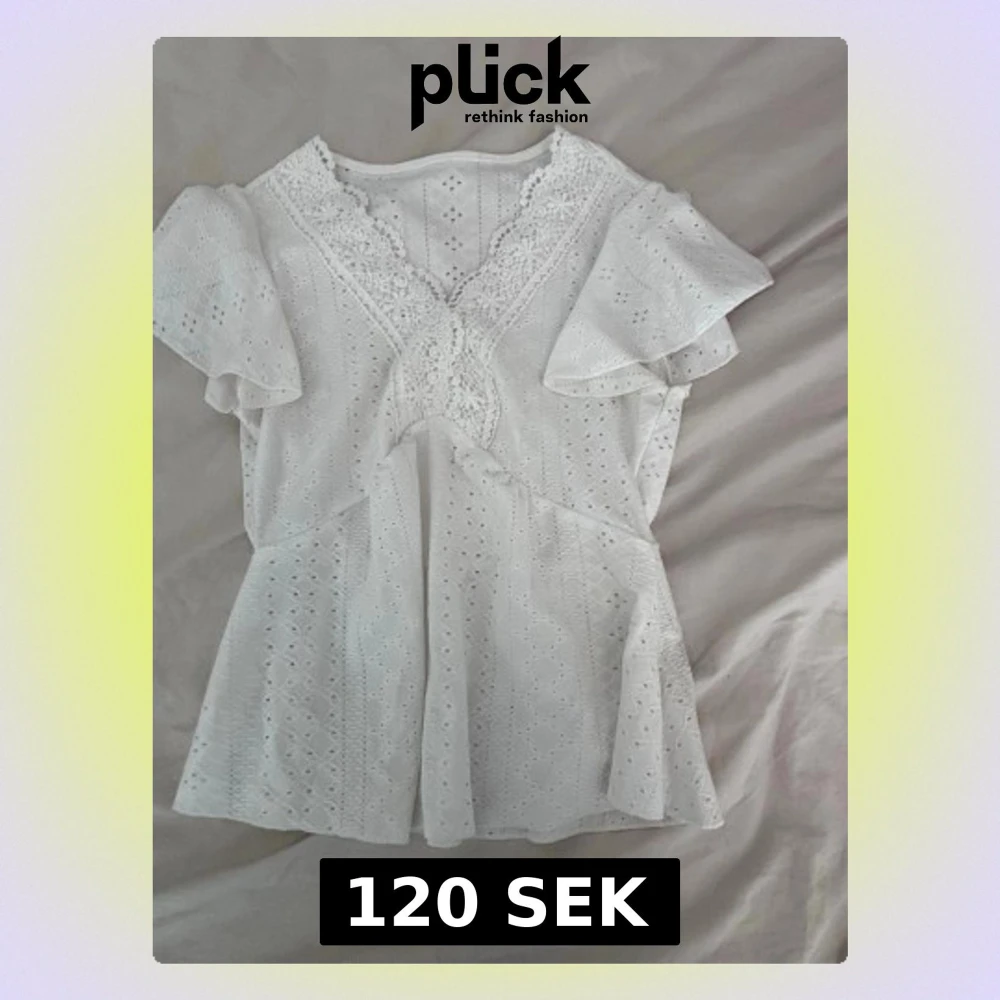 En vit blus som är V-ringad med spets. Tröjan har armar som har volang villkor botten av tröjan också har och har små hål som är mönstrade. Har en liten fläck vid spetsen men syns knappt.