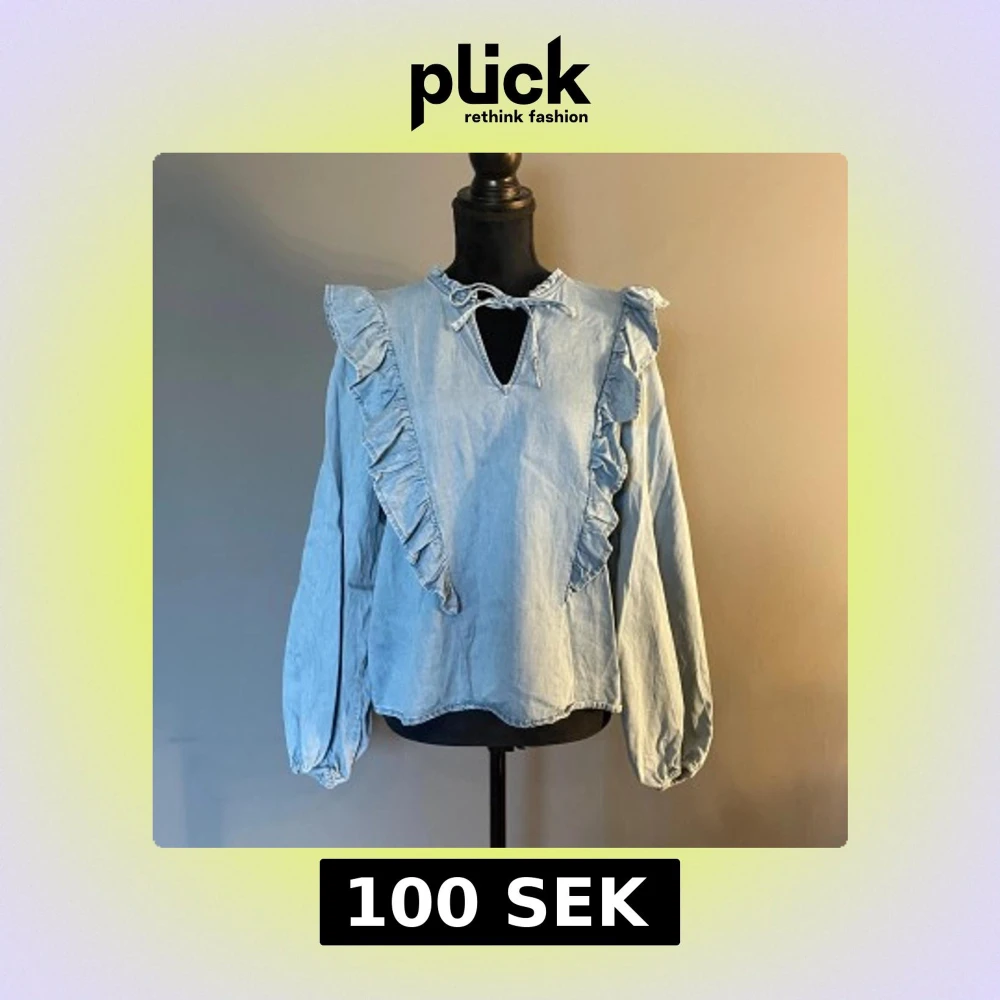 Denna fina blå blus från Kappahl, ser ut att vara i jeans material. Den har volanger fram och baktill. Fram på blusen finns 2 band man kan välja att låta hänga eller knyta för en extra ditalj.