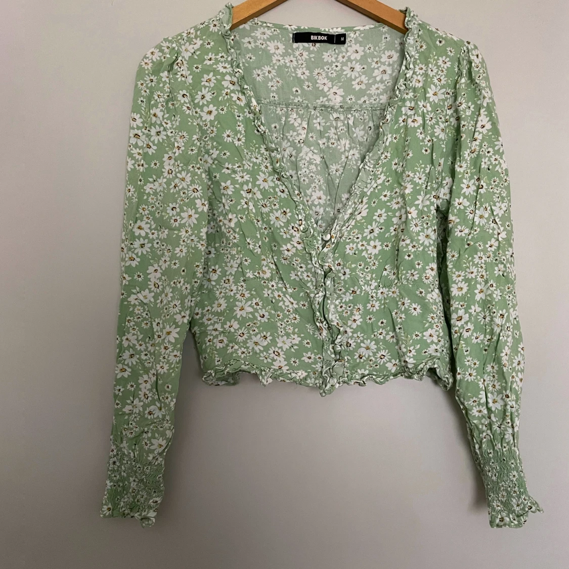 V ringad tröja från bikbok Köpt 2 hand men passade inte En av knapparna är trasig men inget som syns Frakt tillkommer