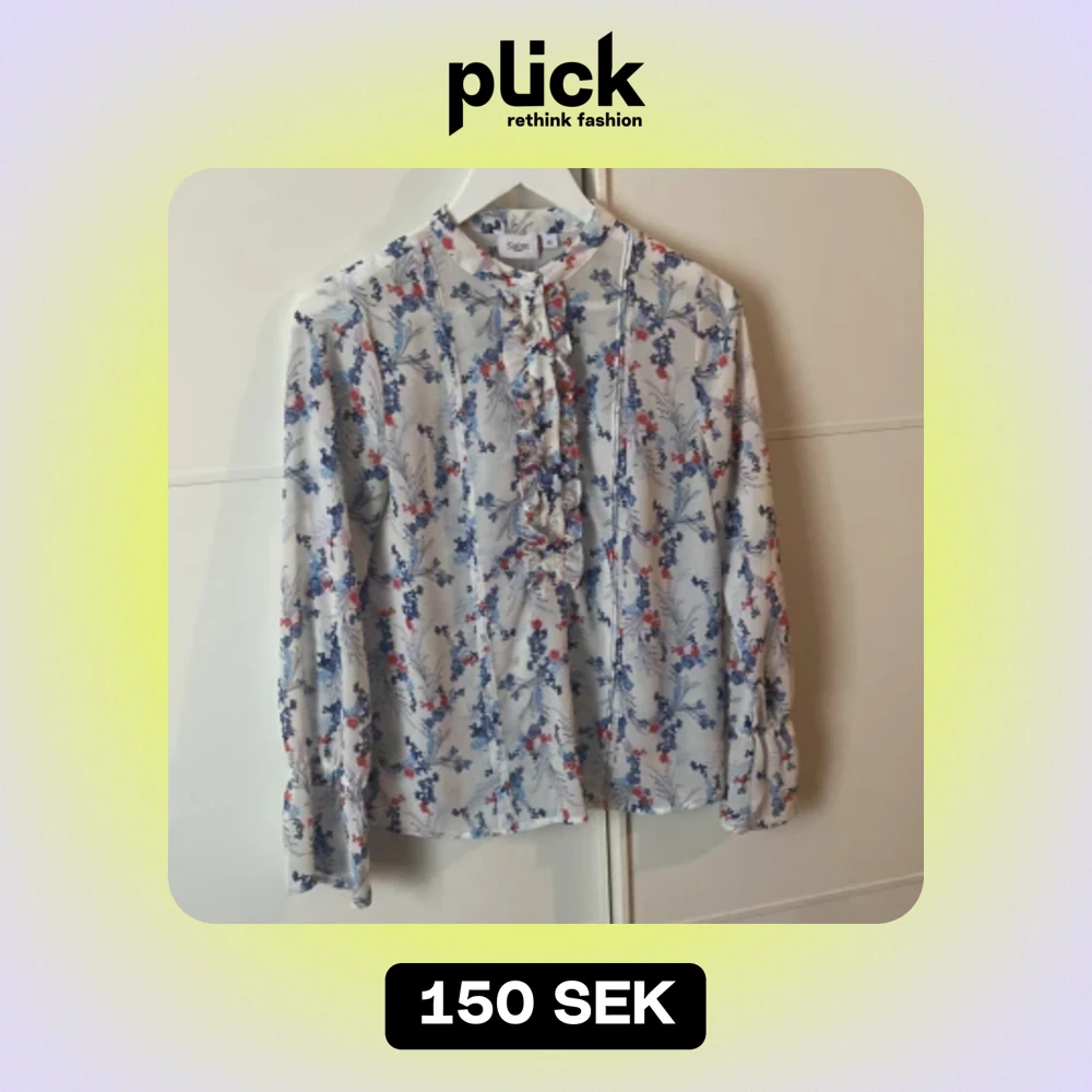 Söt blus med vit botten och blommönster i blått och rött. Väldigt användbar och i mycket gott skick.