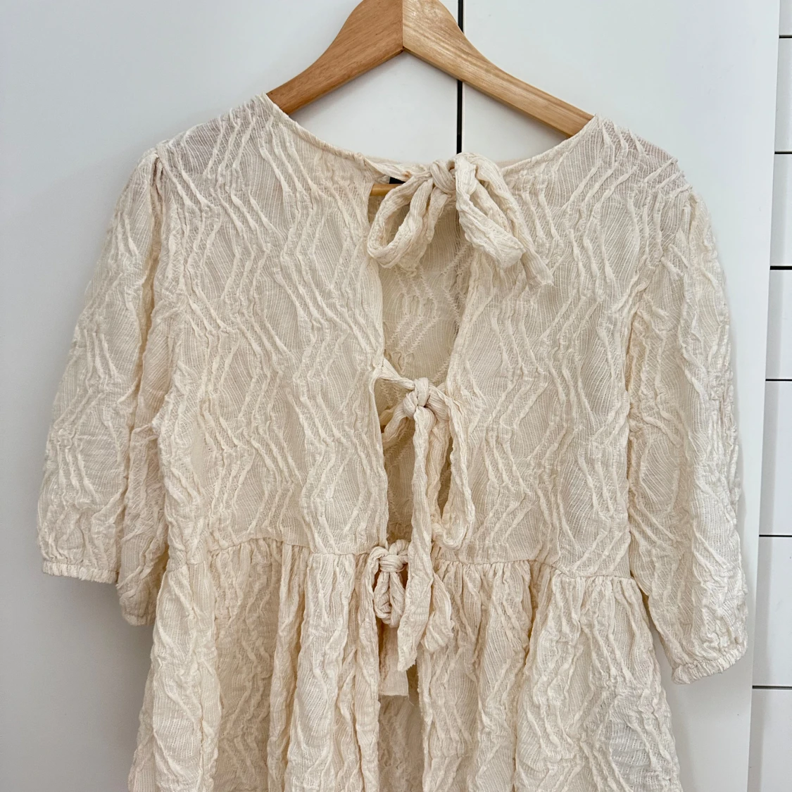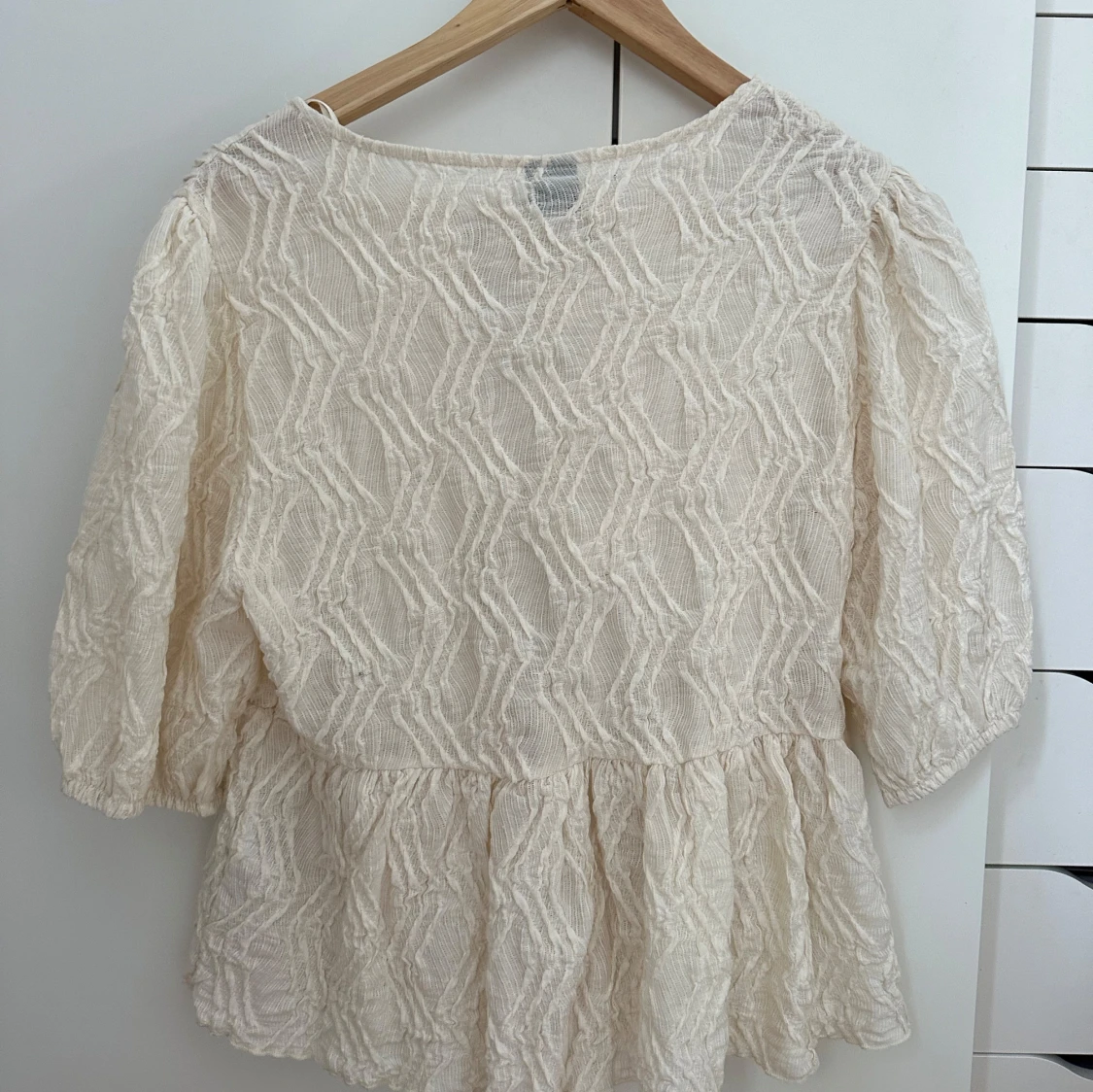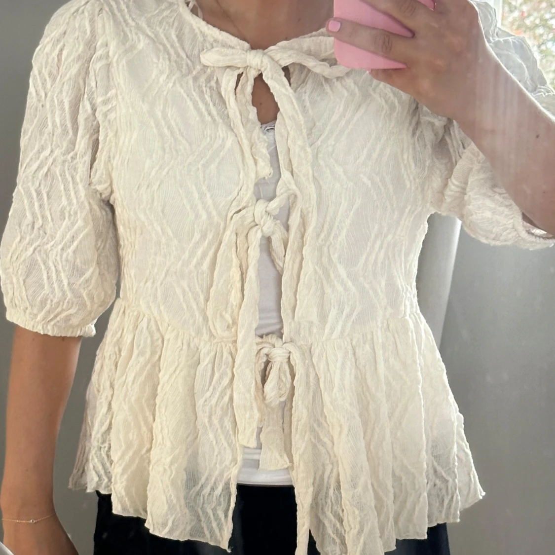 Säljer denna jätte fina beige/ vita blusen med knyte längst fram från ginatricot. Endast använd att fåtal gånger. Hör av er vid frågor om pris eller annat!💖