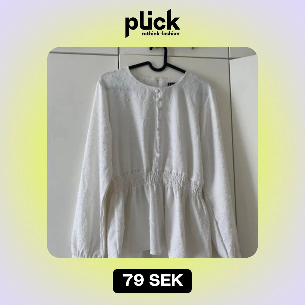 En vit blus med en dragkedja bakom ryggen och små prickiga detaljer. Den är mellan lång blus som sitter vid midjan och som är löst nedåt.