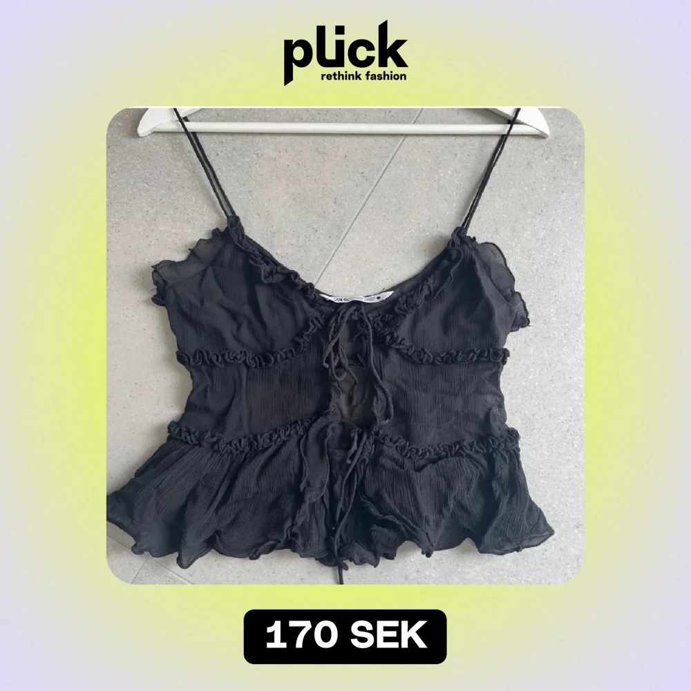 Söt knytblus med volanger i ett tunt kyg, köpte på plick men den passade inte mig så säljer vidare. Lånade bilder.
