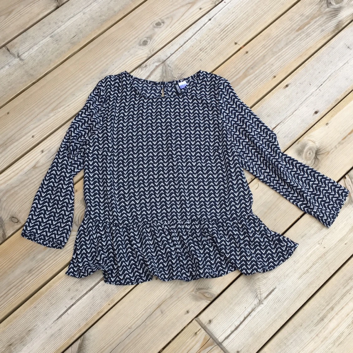 Söt blus med en knapp i ryggen, rak modell med en volangdetalj nertill. Mörk marin med vita små mönster detaljer
