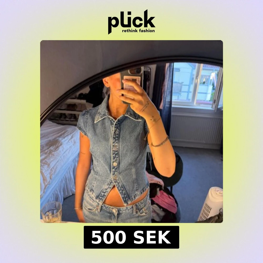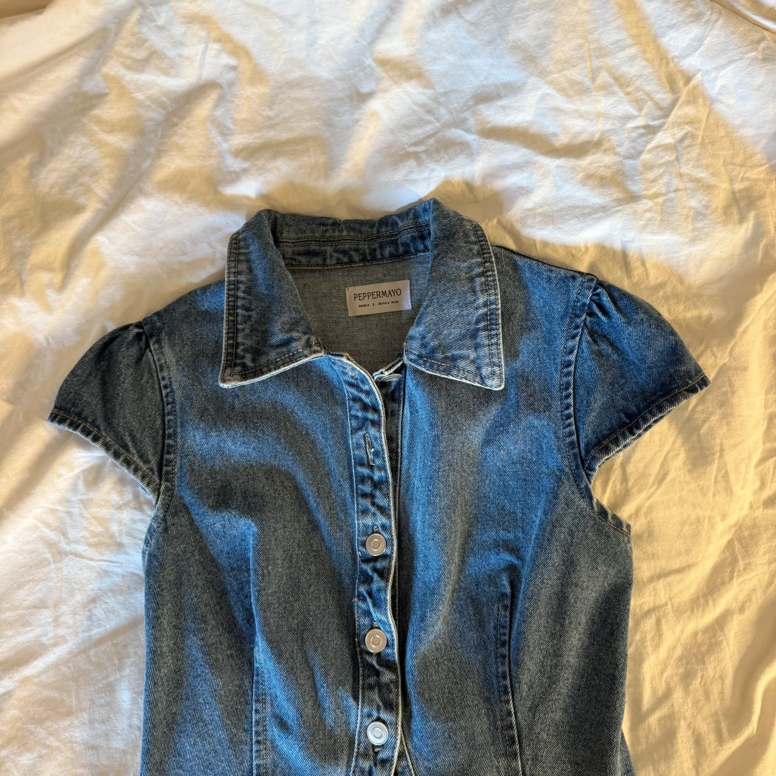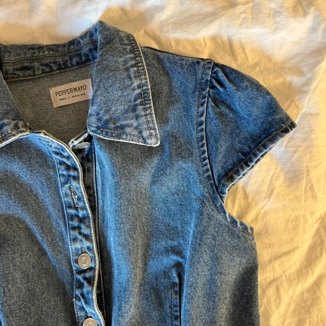 Säljer en snygg jeansblus från Peppermayo i klassisk blå denim. Västen har korta ärmar, markerad krage och knappar framtill. Figurnära passform med coolt omlottliknande snitt nedtill! Aldrig använt! nypris 865kr