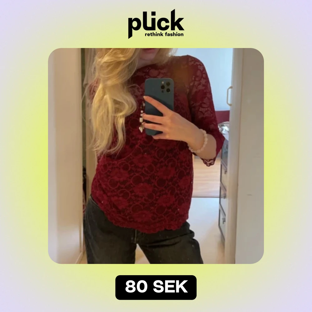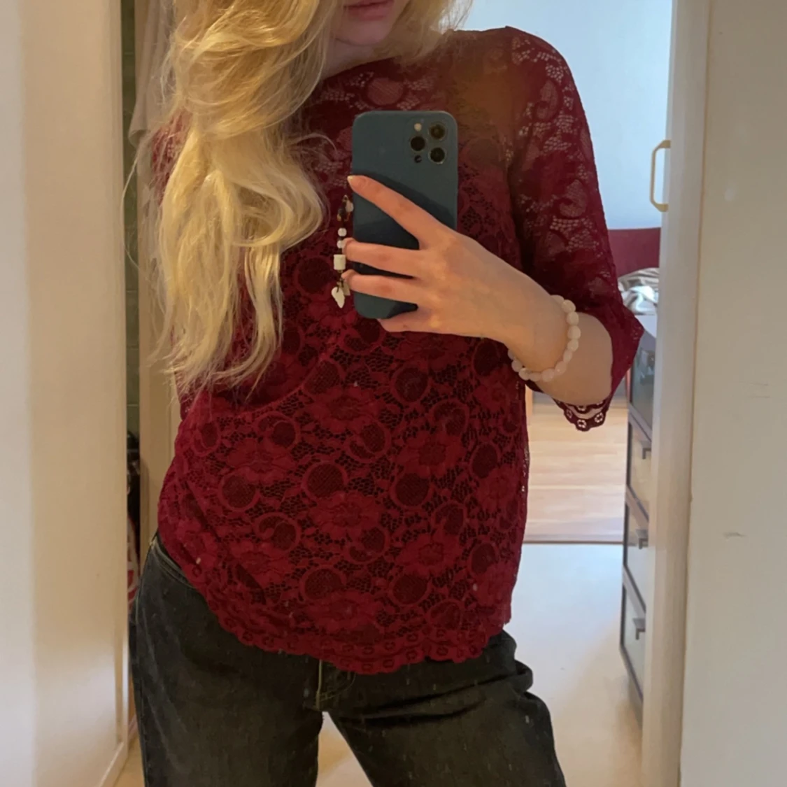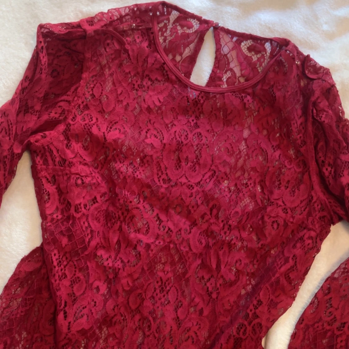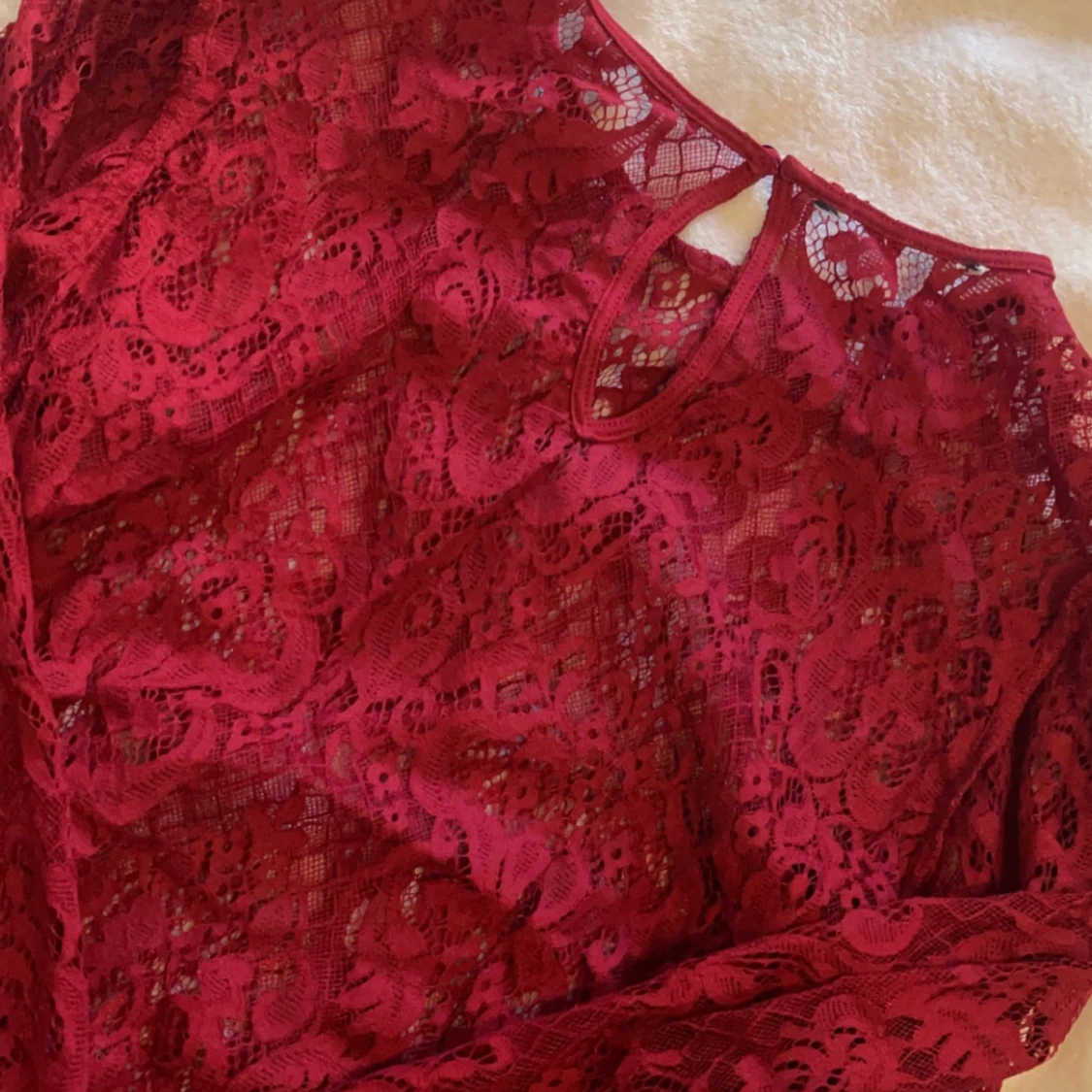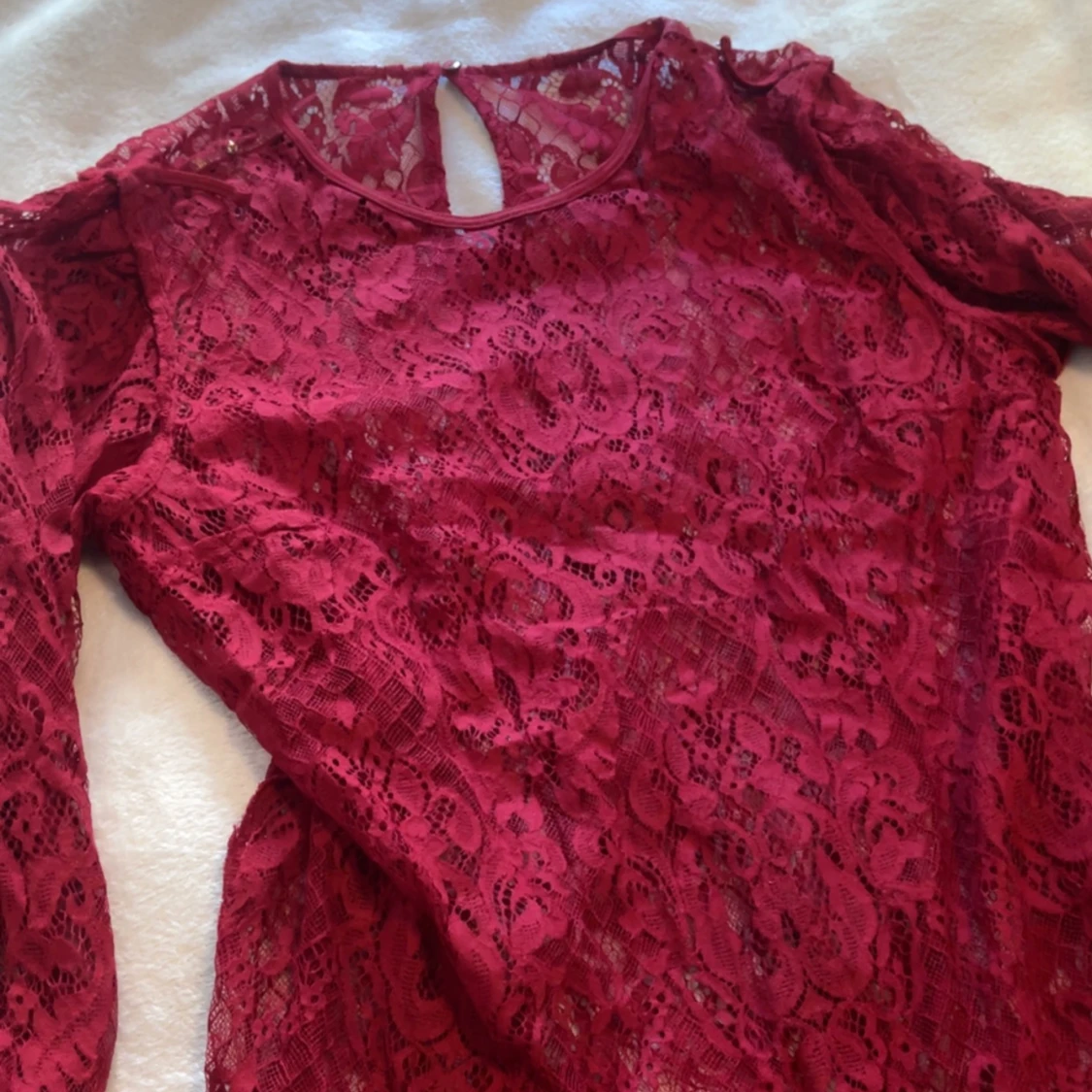 Vinröd (mörkare än på bild) spets tröja! Öppen vid nacken. (OBS: Söndrig kamera därav de suddiga bilderna)