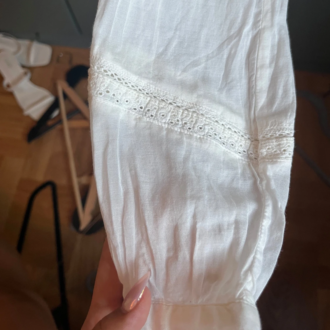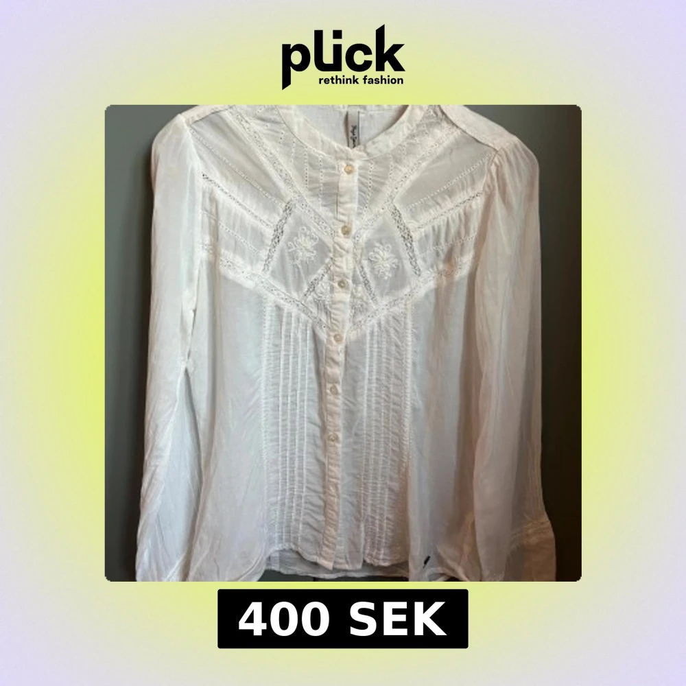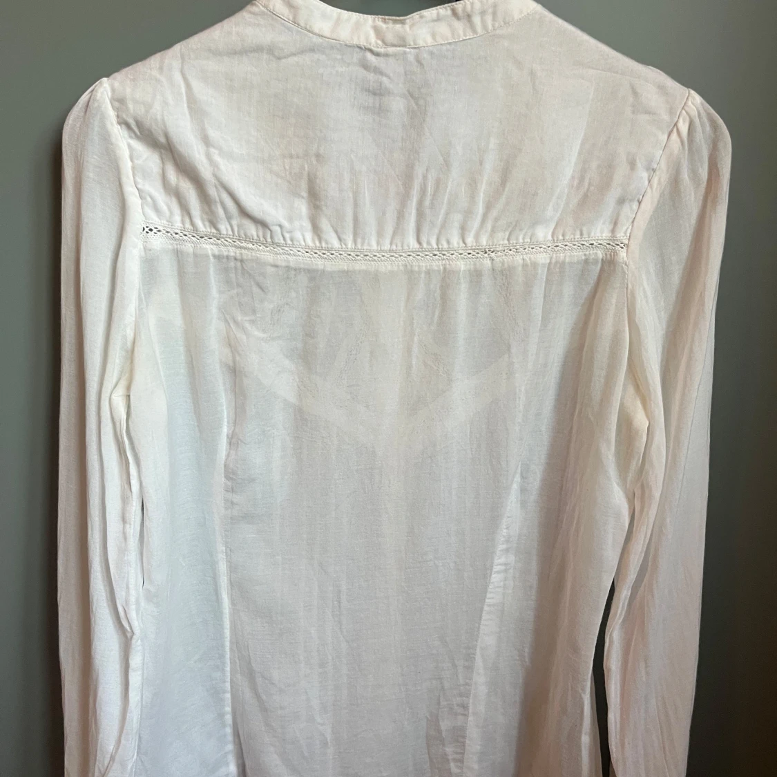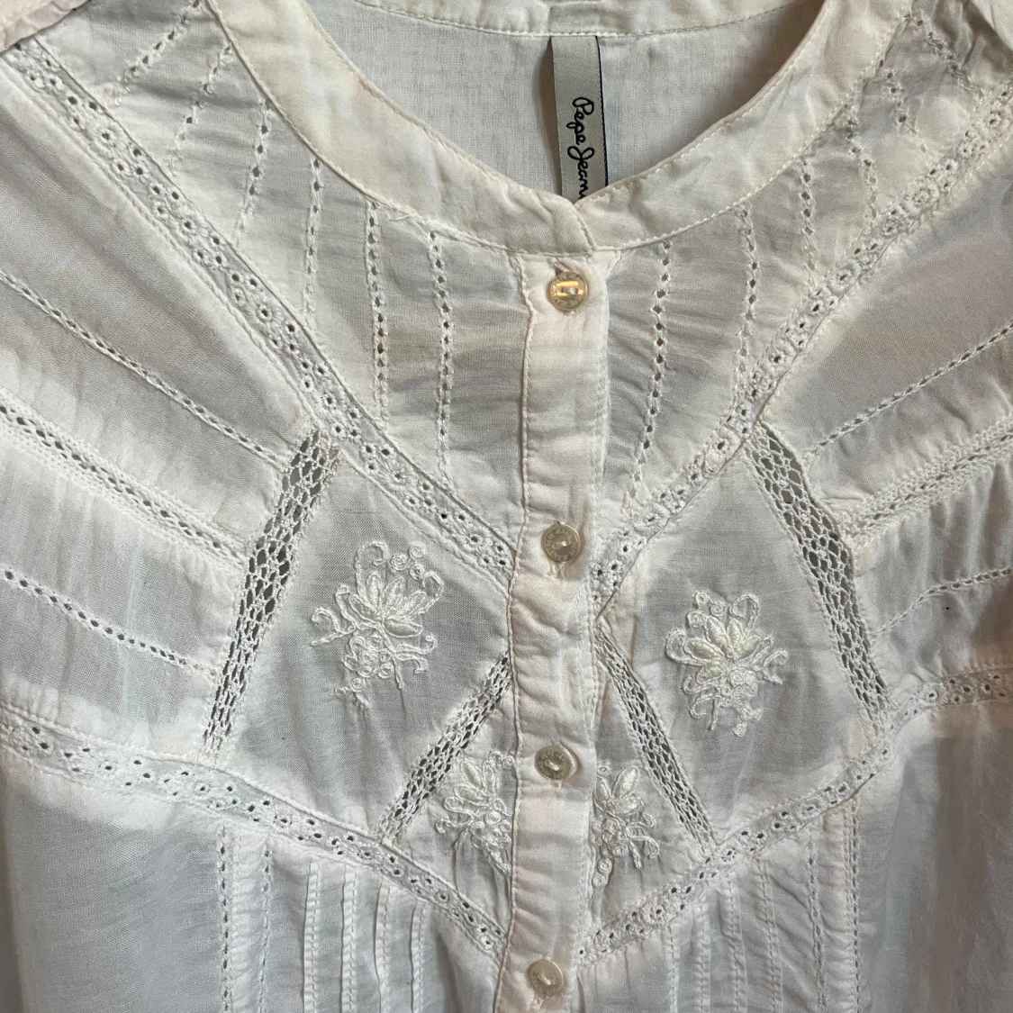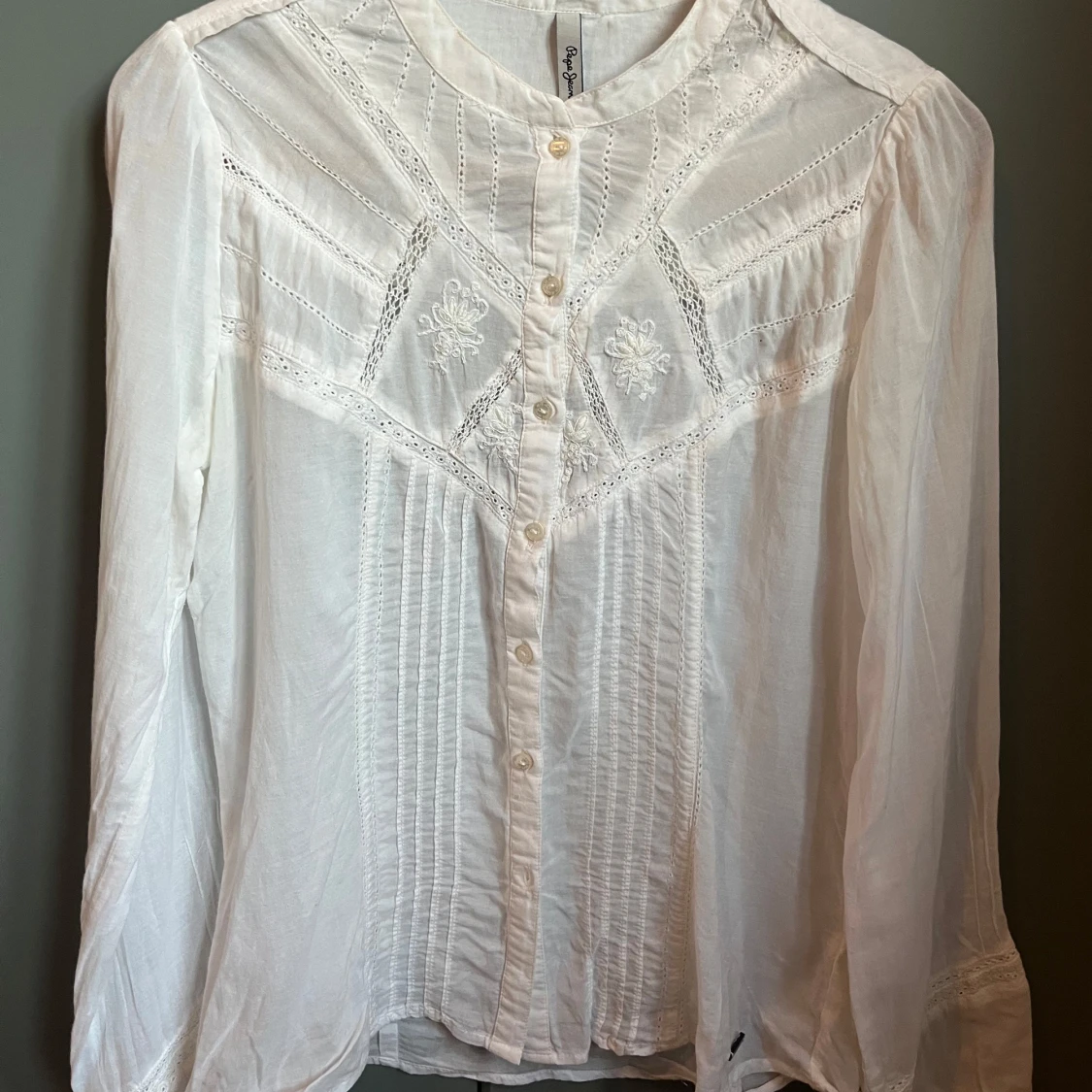 Superfin vit blus från Pepe Jeans med broderade detaljer och spetsinslag framtill. Långärmad modell i tunn bomull med knappar hela vägen och romantiska broderier.