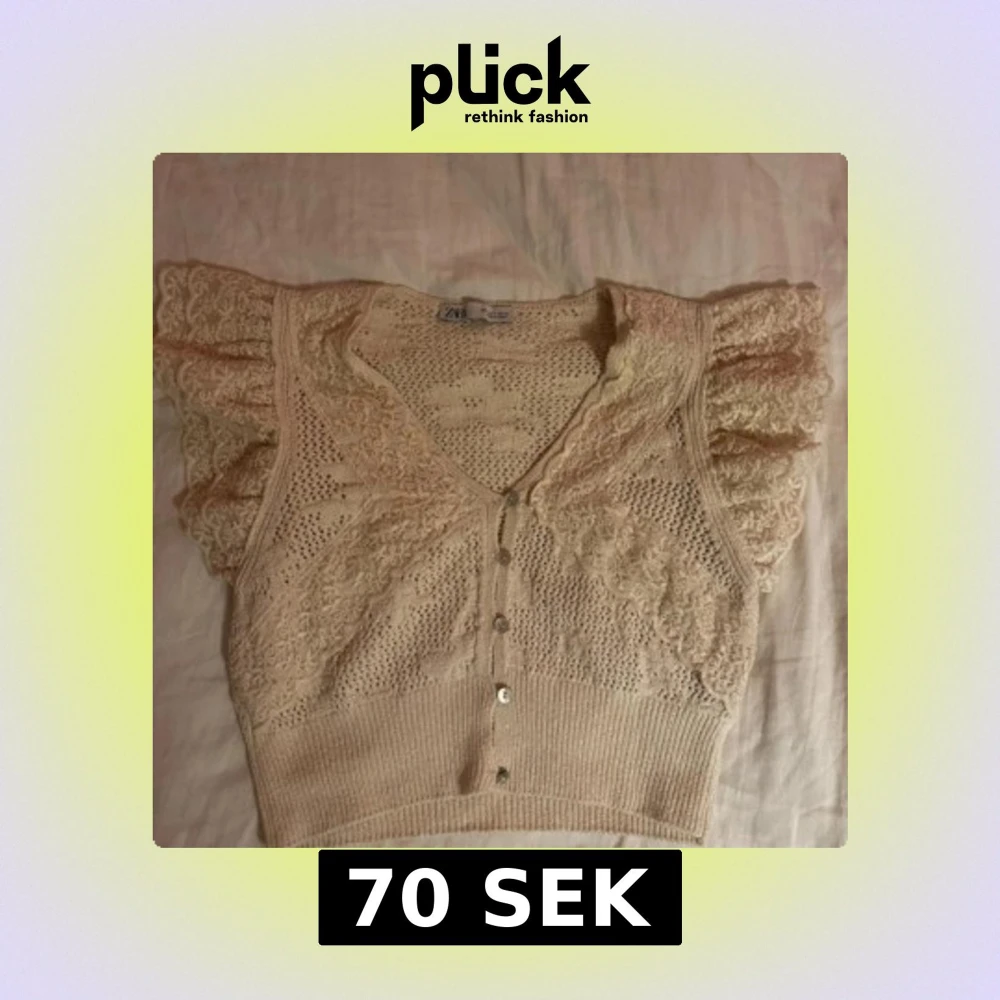 Supersöt beige blus från Zara med v-ringning, knappar framtill och volangiga spetsärmar.