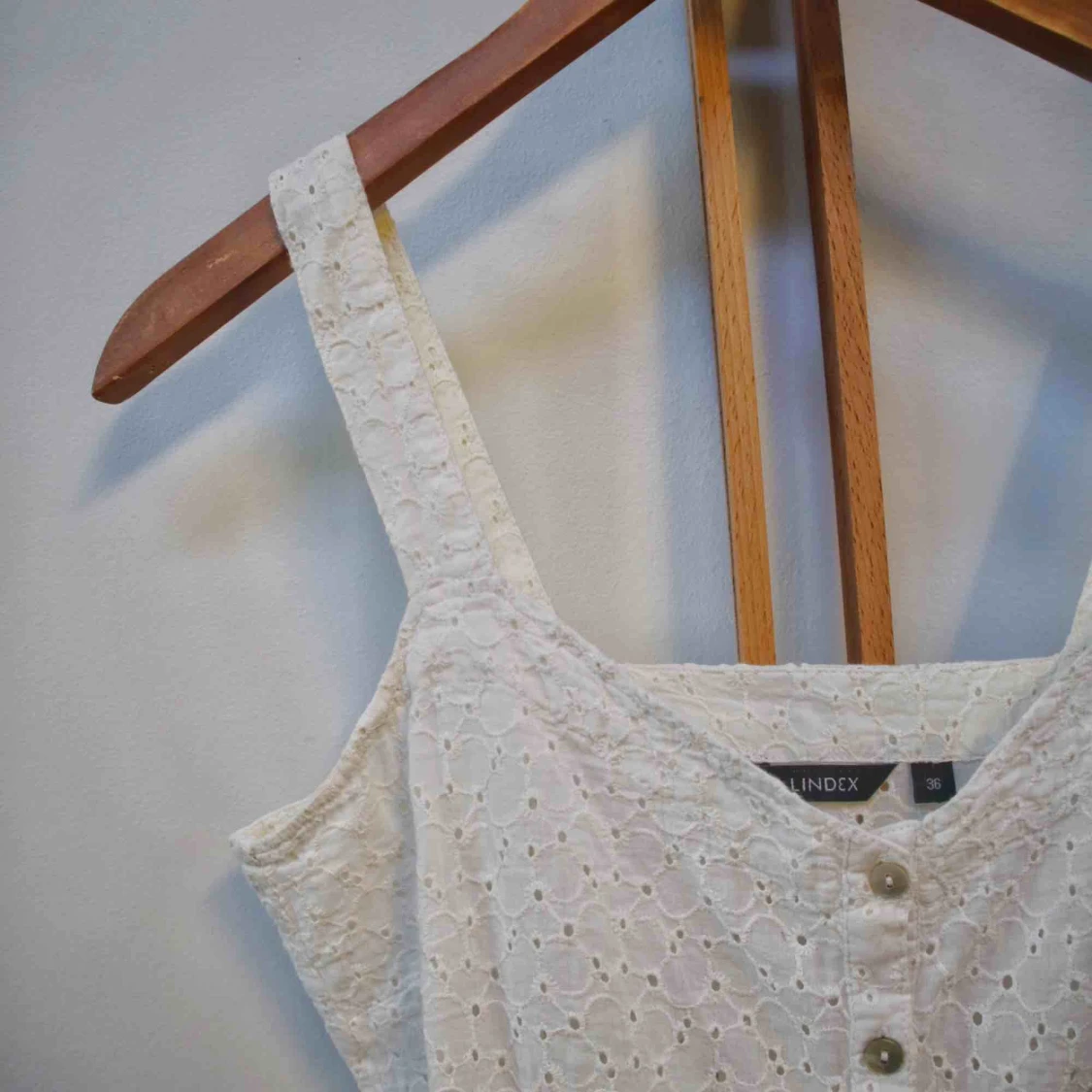 Gulligt sommarlinne i vit spets från Lindex. Knappar framtill, är i storlek 36 men passar även M. Använd ett fåtal gånger. Frakt tillkommer på 18 kr eller så kan jag mötas i Borås eller Kungsbacka.