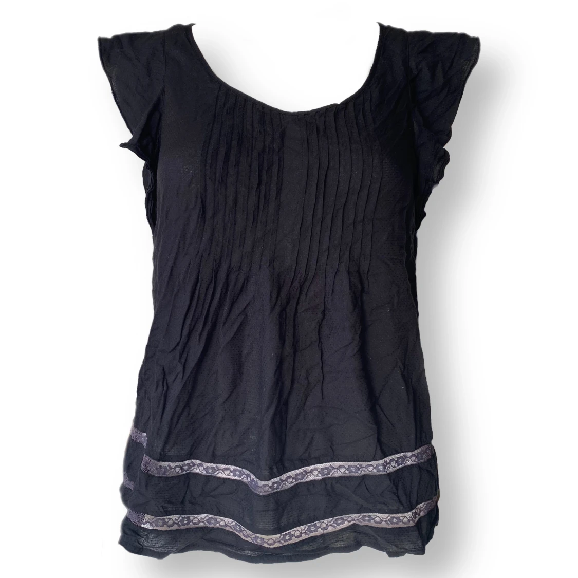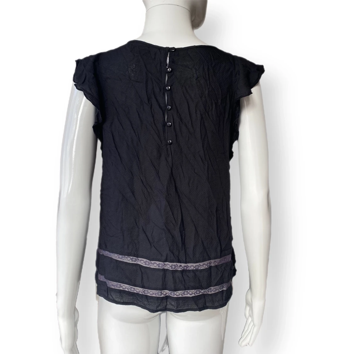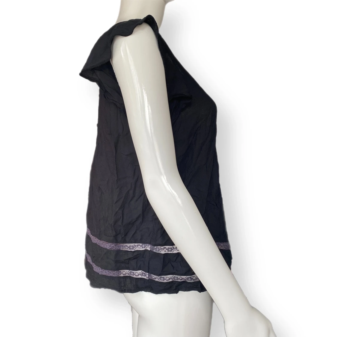En genomskinlig svart blus i storlek 34 från Miss Milla. Väldigt flowy och bred. Diskreta små prickar på tyget. Svart färg med lila spets. Krymper max 5% i tvätten. 100% Viscose. MÅTT: Axel till axel 29cm, armhåla till armhåla 47cm & längd 55cm