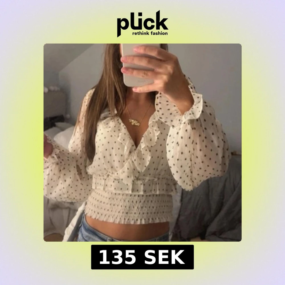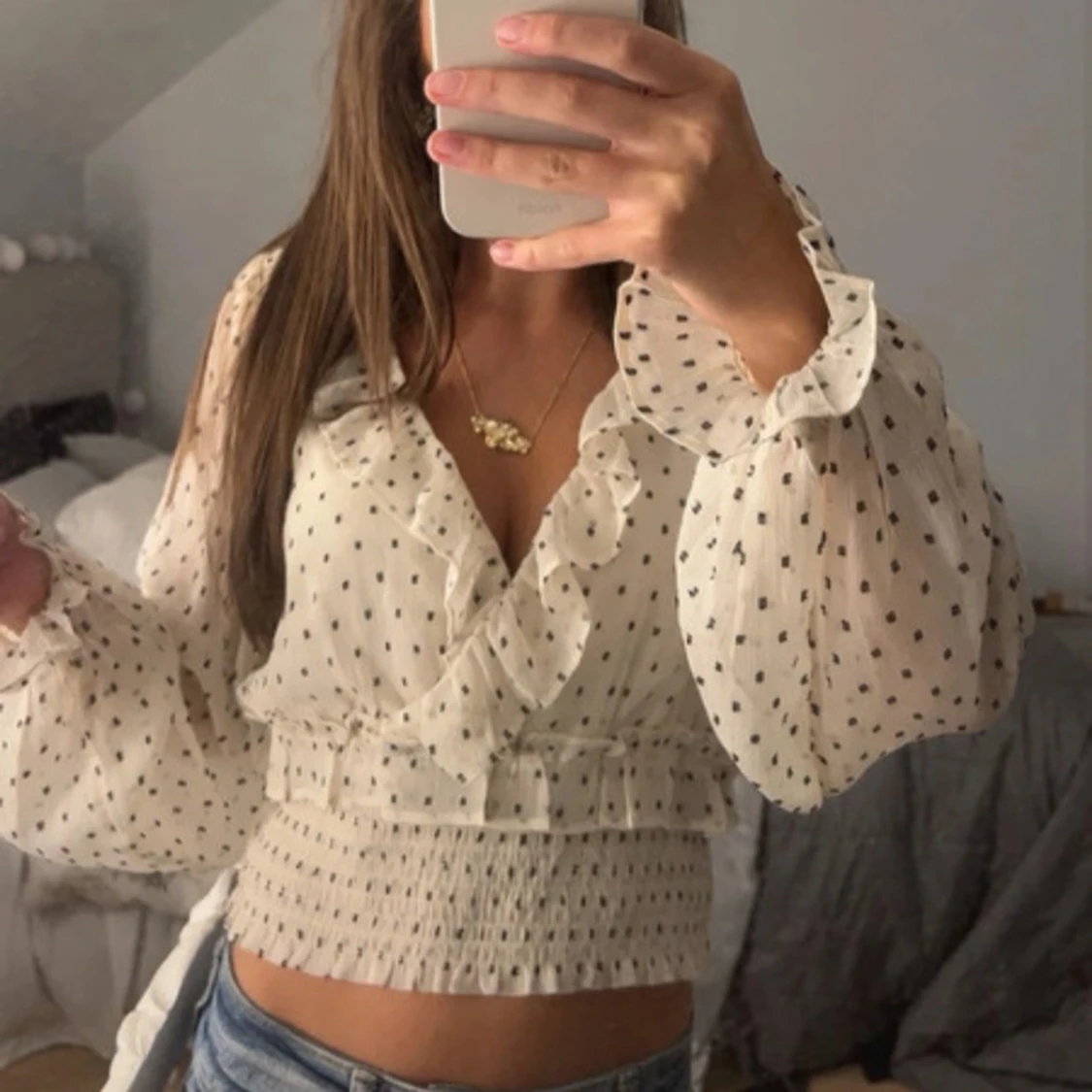 Supersöt vit blus med svarta prickar, omlottmodell och volangdetaljer lĂ€ngs urringningen. Blusen har lĂ„nga, luftiga Ă€rmar och smockad midja som ger en snygg passform. köpt av en tjej pĂ„ vinted, sĂ€ljer vidare dĂ„ den ej passade!đ(lĂ„nad bild?