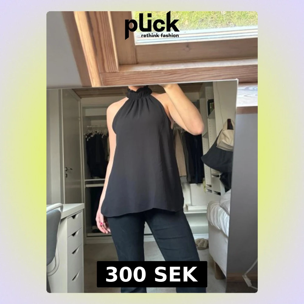 Säljer en svart blus från H&M i storlek XS. Toppen har en hög krage med volangdetalj och är ärmlös med en loose passform. Materialet är lätt och flowy, perfekt för att skapa en chill och stilren look. Passar dig som gillar minimalistisk stil. Aldrig använd🩷🩷