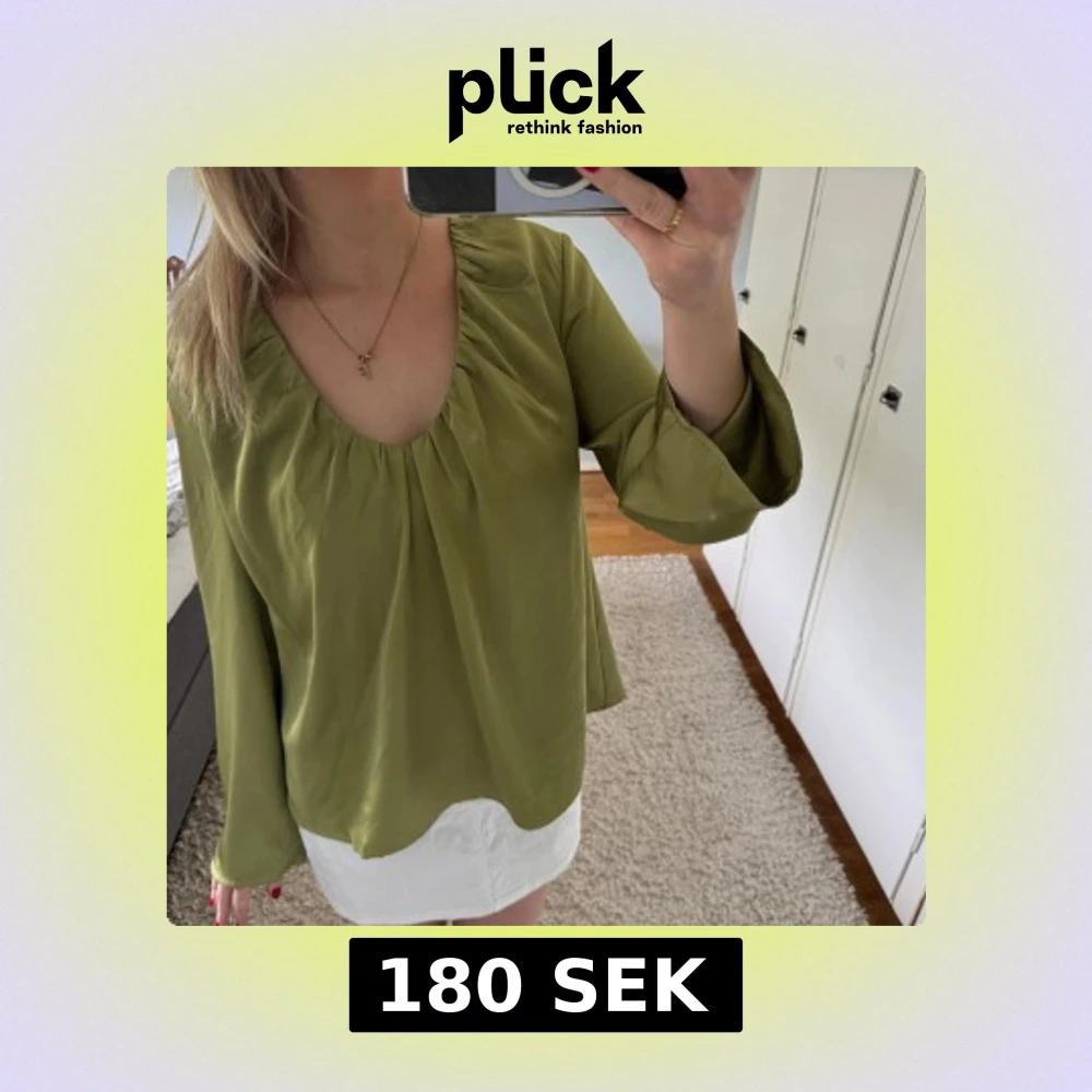 Säljer en olivgrön blus från NA-KD med lång ärm och smickrande passform. Blusen har rundad halsringning med rynkade detaljer och är tillverkad i ett mjukt, lätt material. Perfekt för en stilren och avslappnad look.